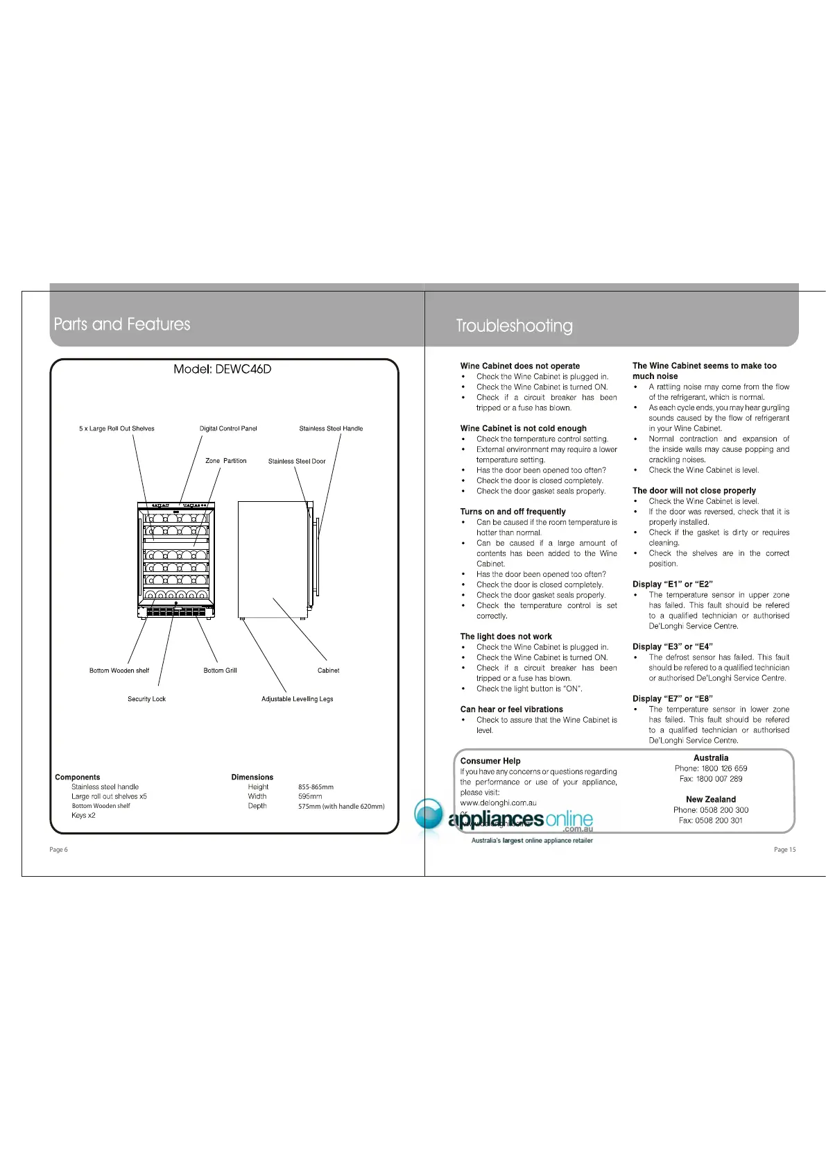 DeLonghi DEWC155D - Parts and Features; Troubleshooting; Wine Cabinet does not operate; Wine Cabinet not cold enough