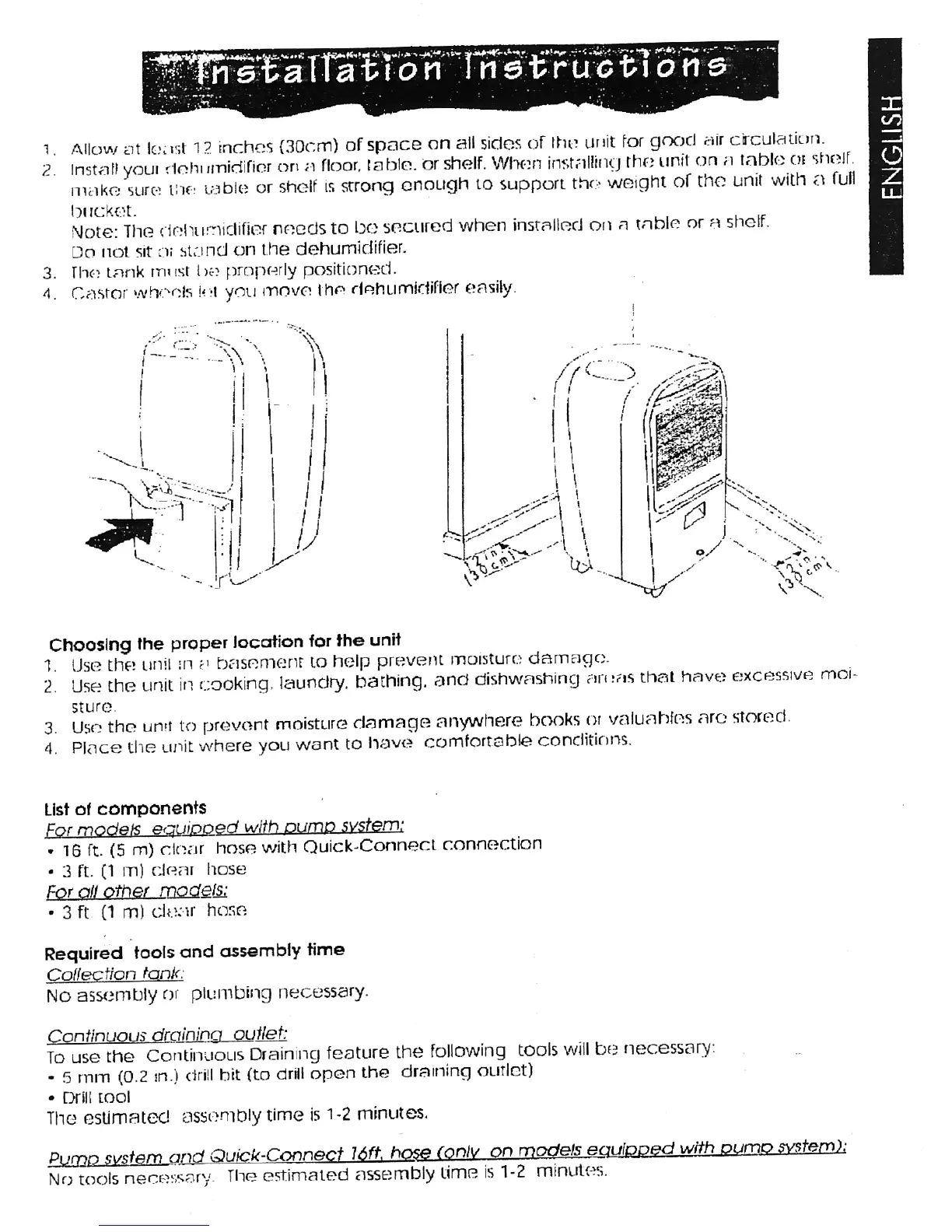 DeLonghi DH400P - Installation Instructions; Proper Unit Location; Included Components; Tools and Assembly Time