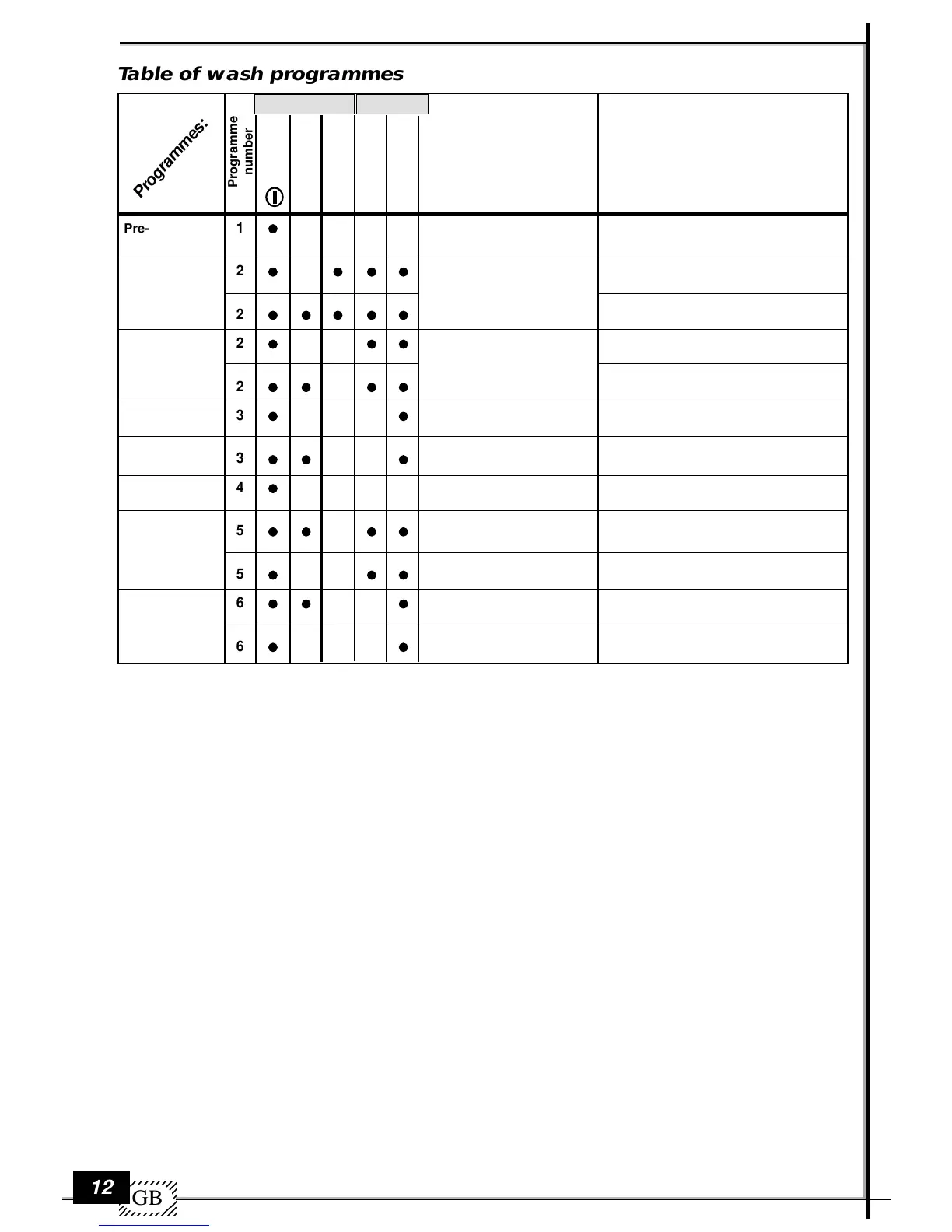 Table of wash programmes