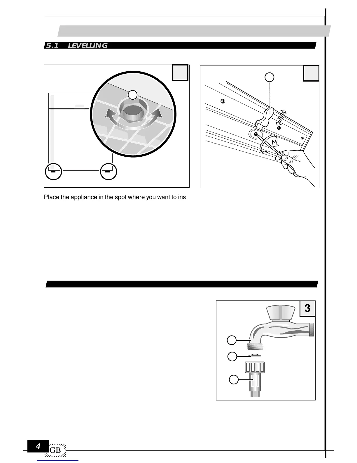 Place the appliance in the spot where you want to install it. Use feet P (unscrew or screw in) to regulate
