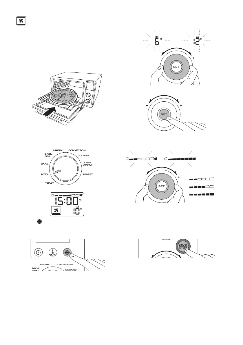 Turn the Time/temperature/toast color/pizza size/slices/tray