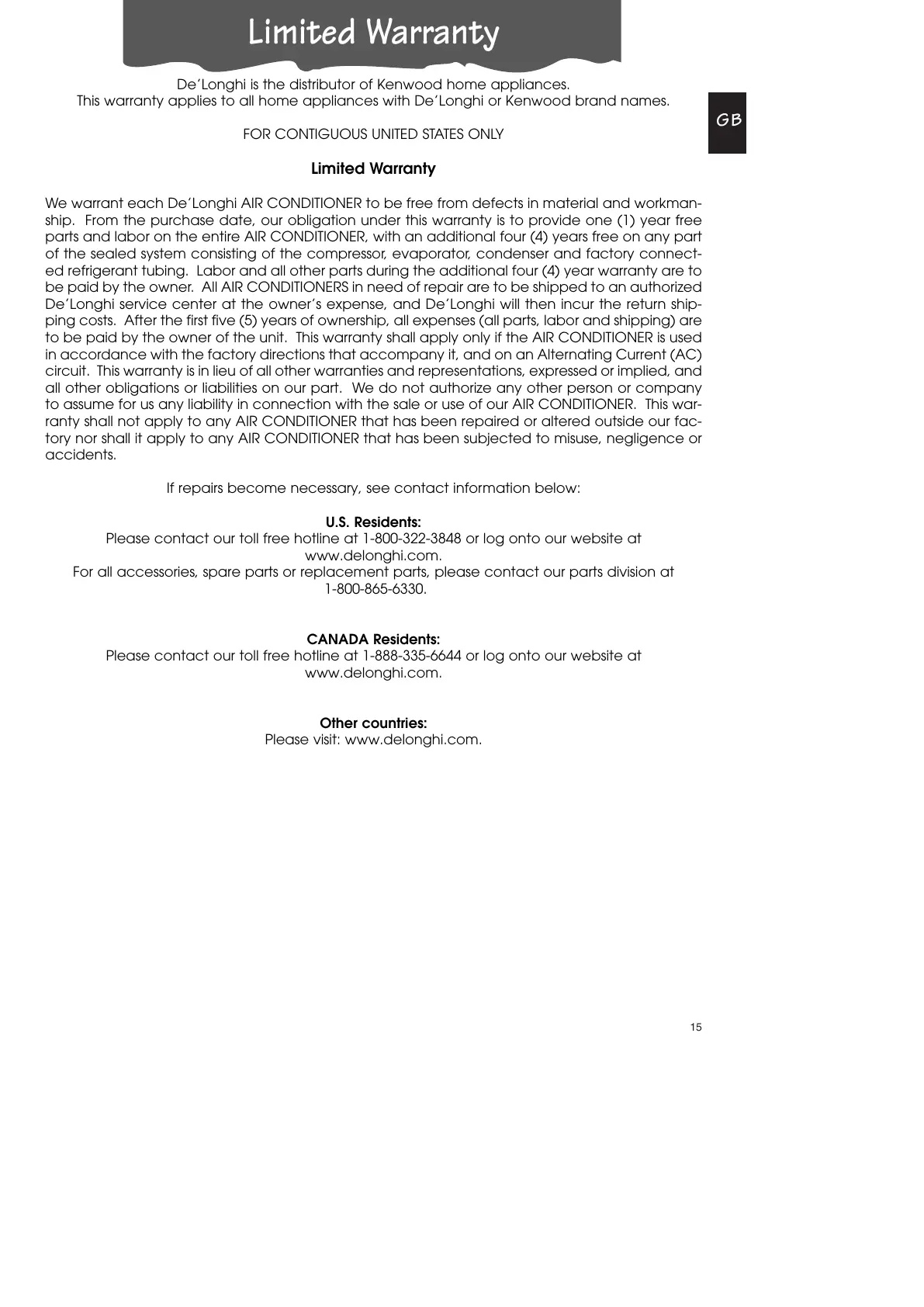 This warranty applies to all home appliances with De’Longhi or Kenwood brand names.