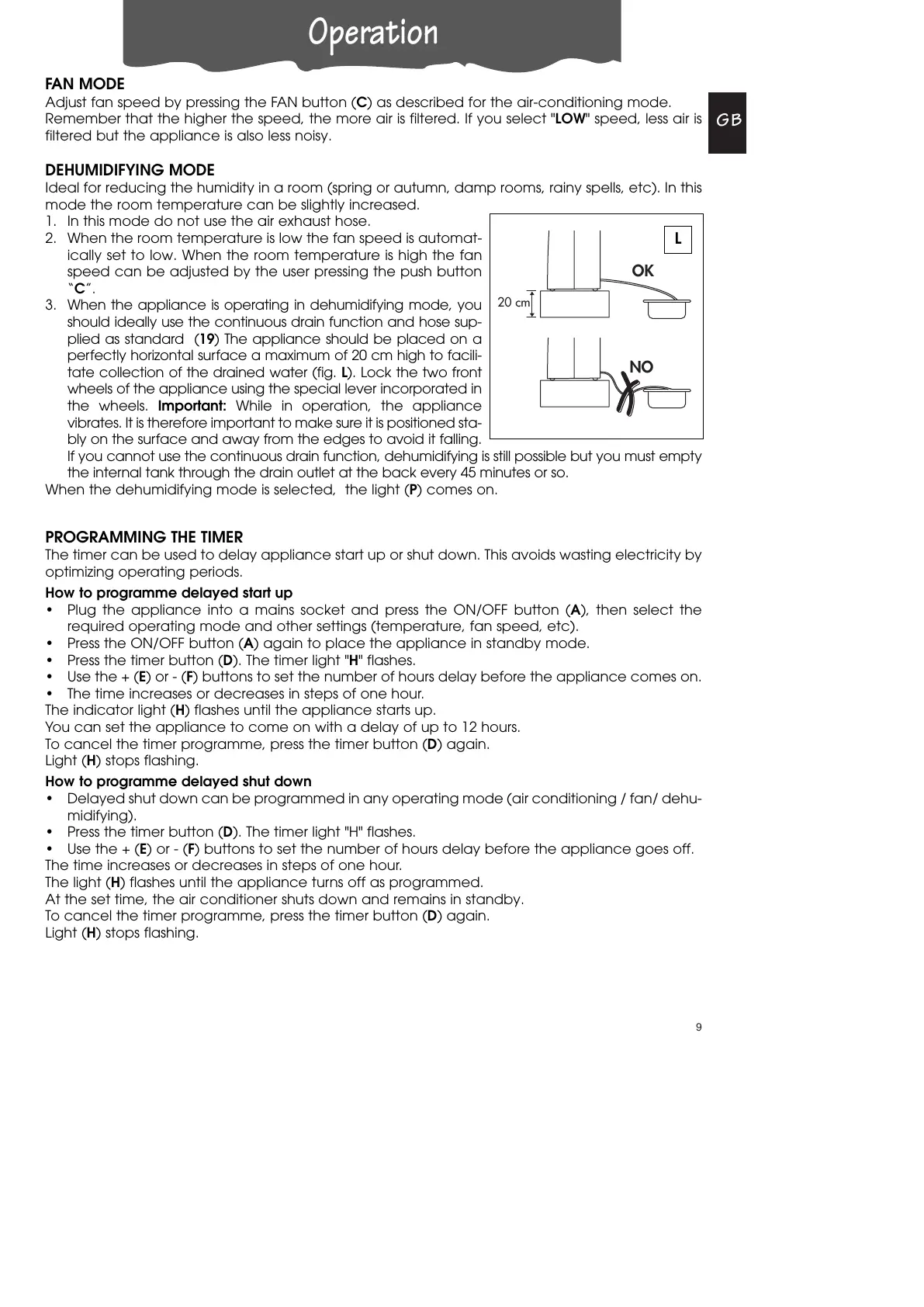 • Delayed shut down can be programmed in any operating mode (air conditioning / fan/ dehu-