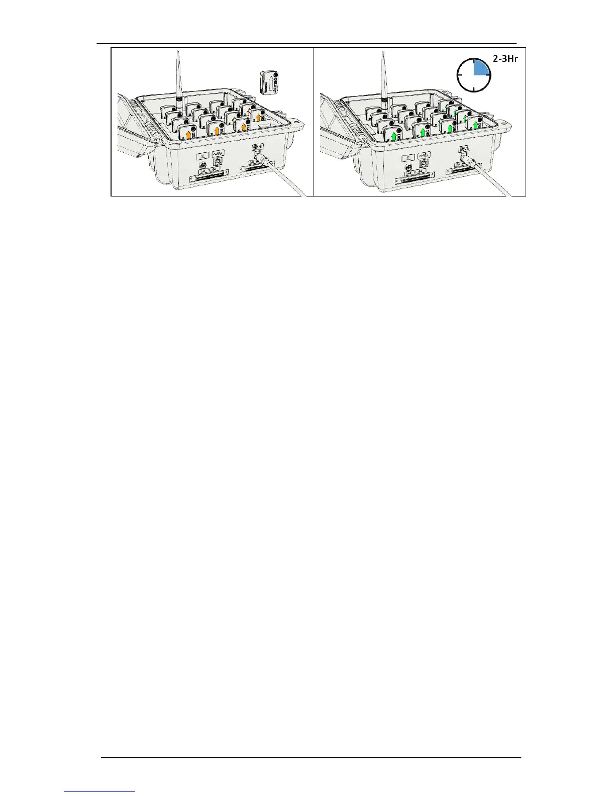 and begin battery charging indicated by an amber LED indicator. Once fully charged, the