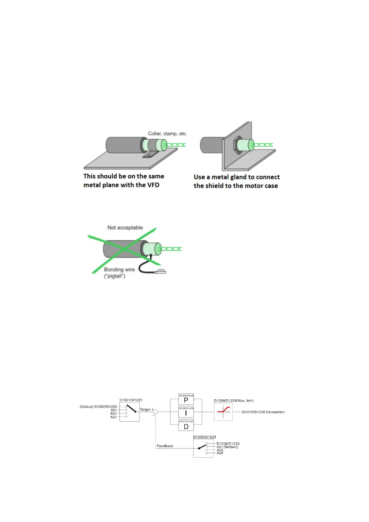 Connecting the shield via a pigtail directly to the VFD ground terminal is not
