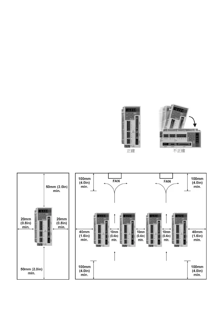 為了使散熱風扇能夠有比較低的風阻以有效排出熱量,請使用者遵守一台與多台交流伺服驅動器的安裝間
