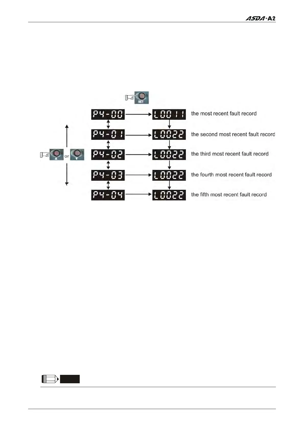 After entering the parameter mode P4-00 to P4-04 (Fault Record), press SET key to display