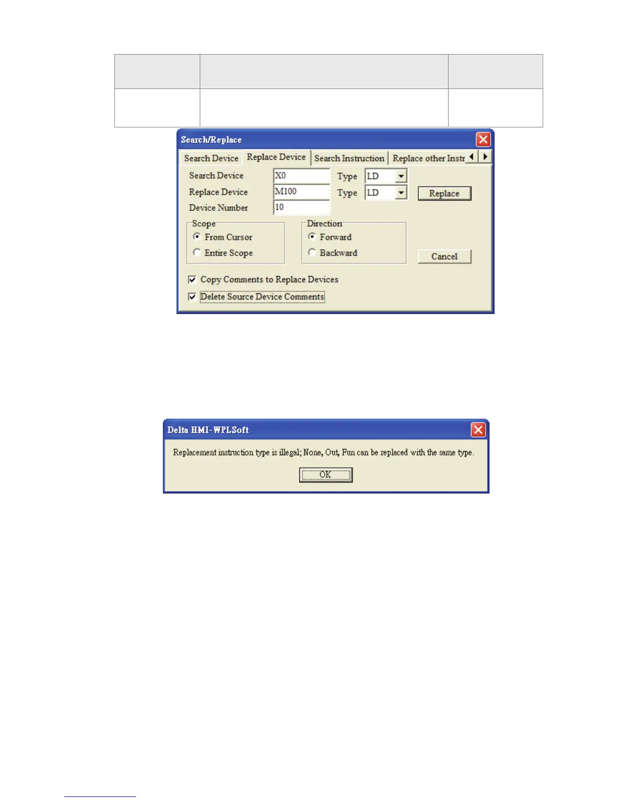button is pressed, the comment of the search device “X0” will be copied to the replace