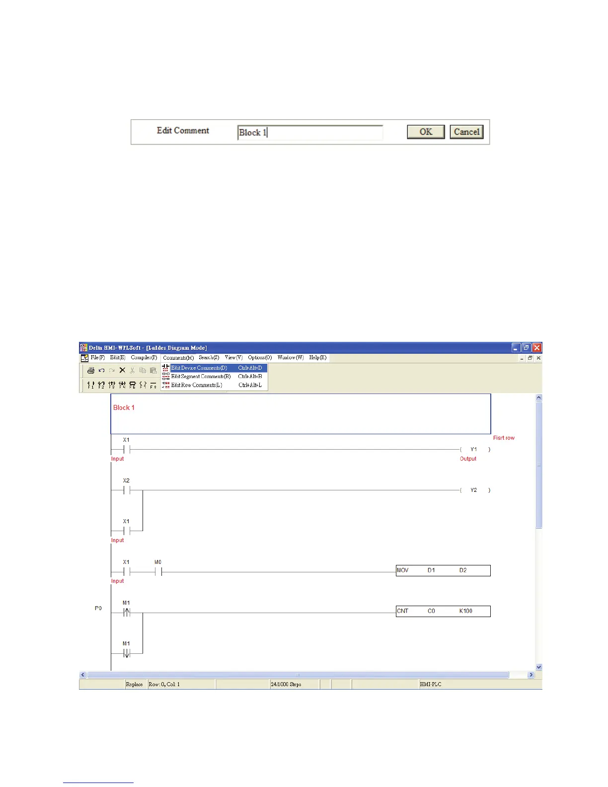 In the Ladder Diagram Mode and Instruction Mode, the user can set the comments to be