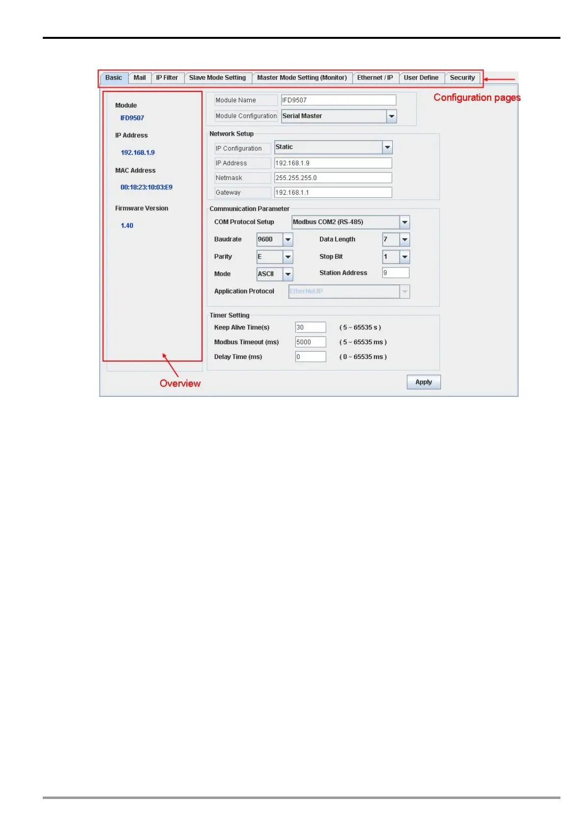 The basic settings include parameters as module name, network settings and series communication. Please