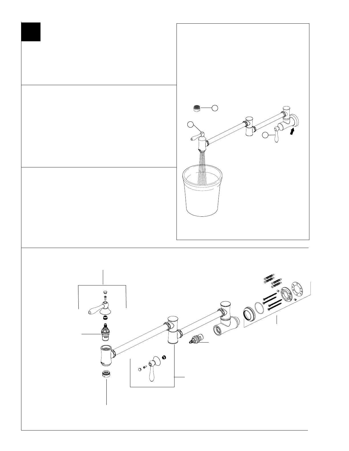 Remove aerator (1) and turn faucet handles (2) to the full on