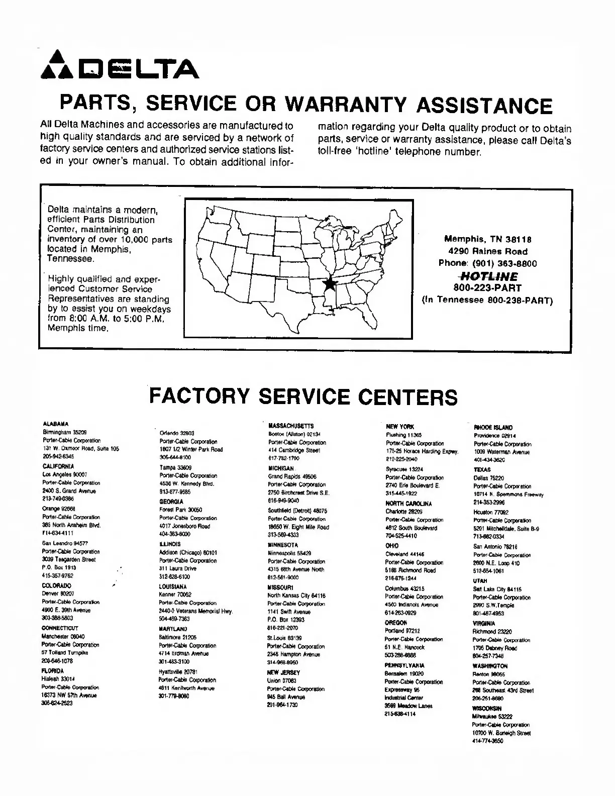 Delta 2000 Series - Parts, Service or Warranty Assistance; Factory Service Centers