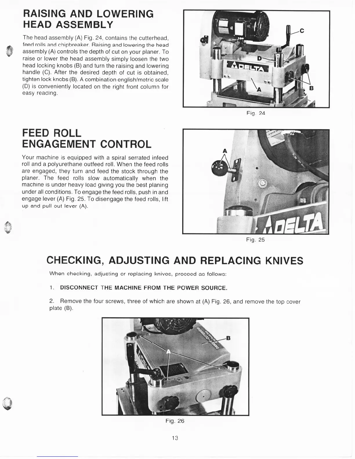 Delta 22-660 - Raising and Lowering Head Assembly; Feed Roll Engagement Control; Checking, Adjusting and Replacing Knives