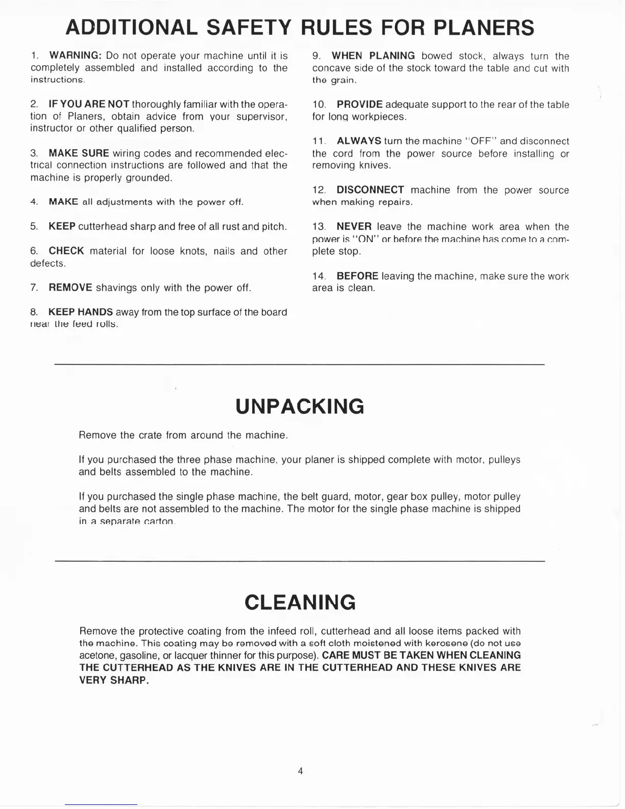 Delta 22-660 - Additional Safety Rules for Planers; Unpacking; Cleaning