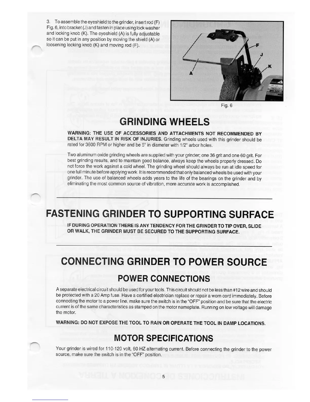 Delta 23-580 - Grinding Wheels; Grinding Wheel Specifications; Fastening Grinder to Supporting Surface; Connecting Grinder to Power Source