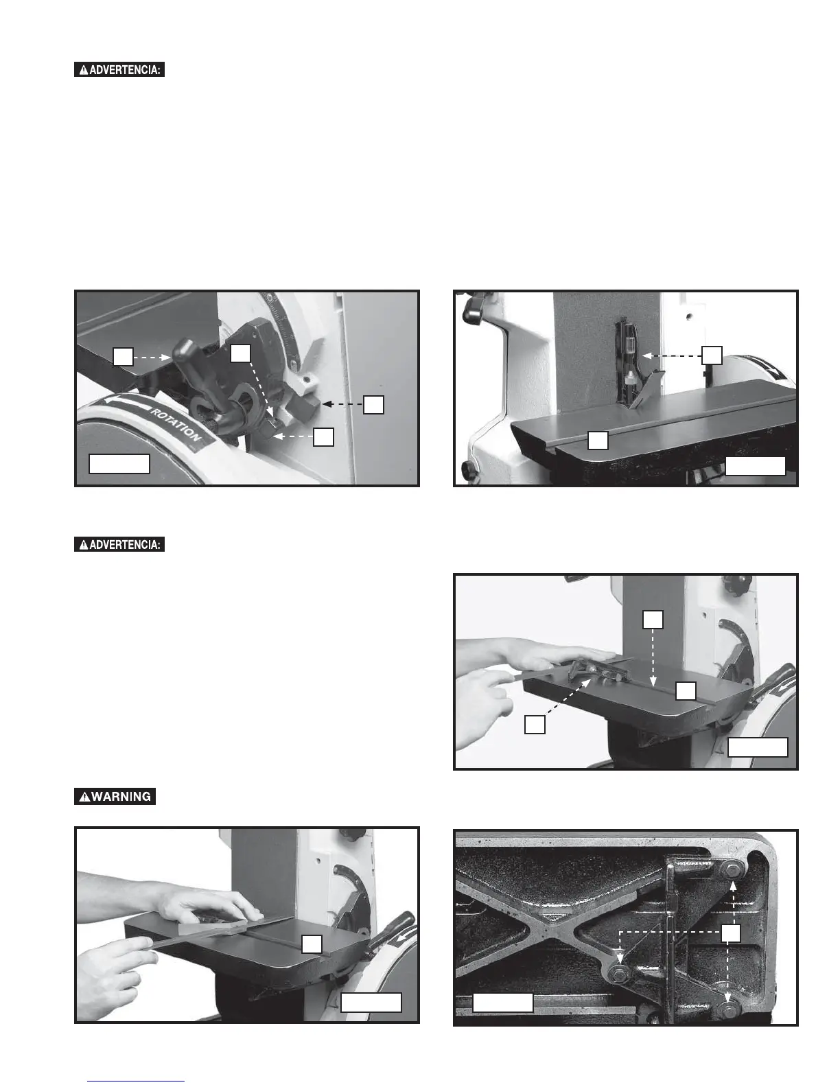 5. El tornillo de ajuste (F) Fig. 43 asegura que el banco para banda pueda colocarse nuevamente con rapidez en la posición de