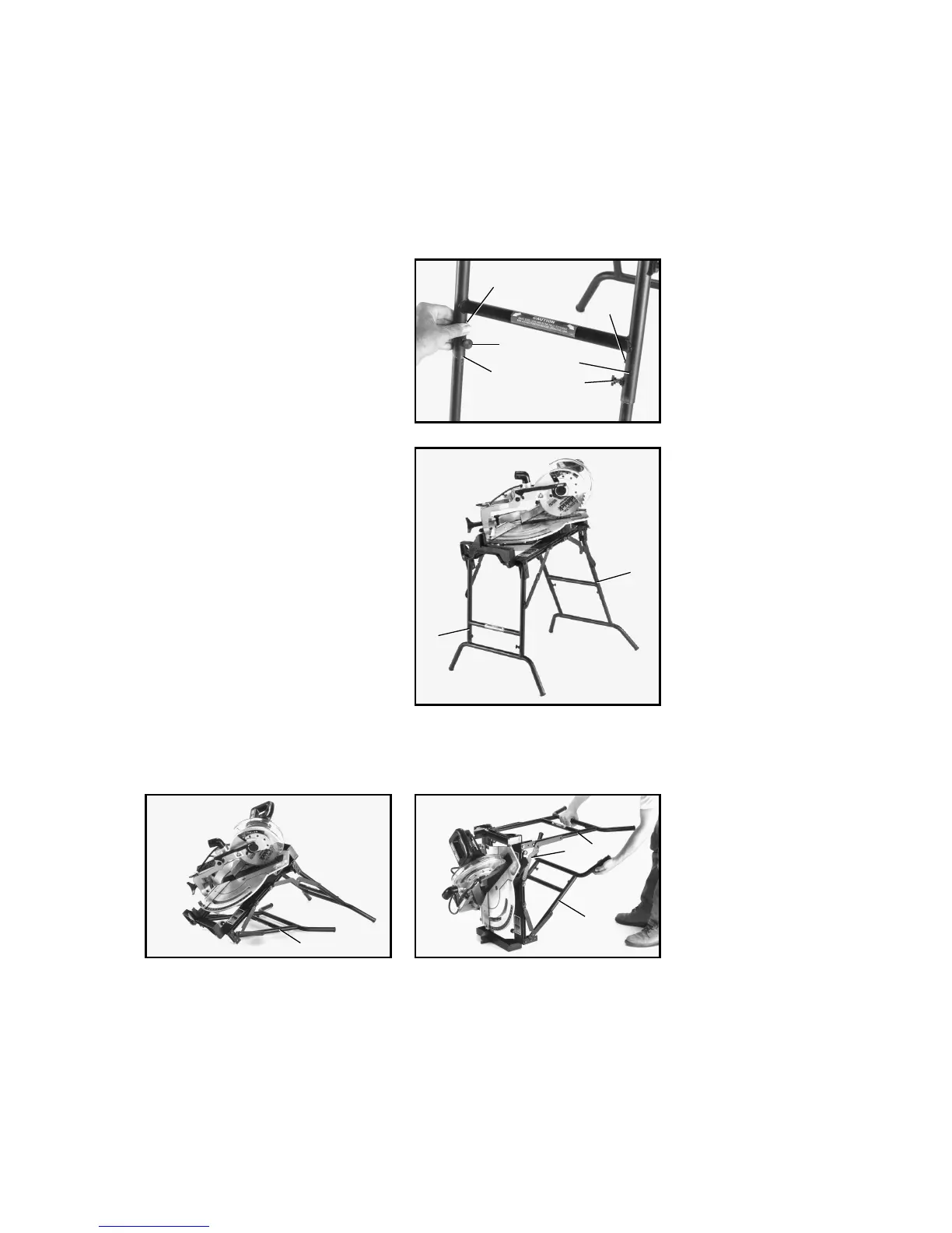 saw base. Leg (C) will contact and unlock hinges (E) of right leg (D), enabling right leg (D) to be folded.