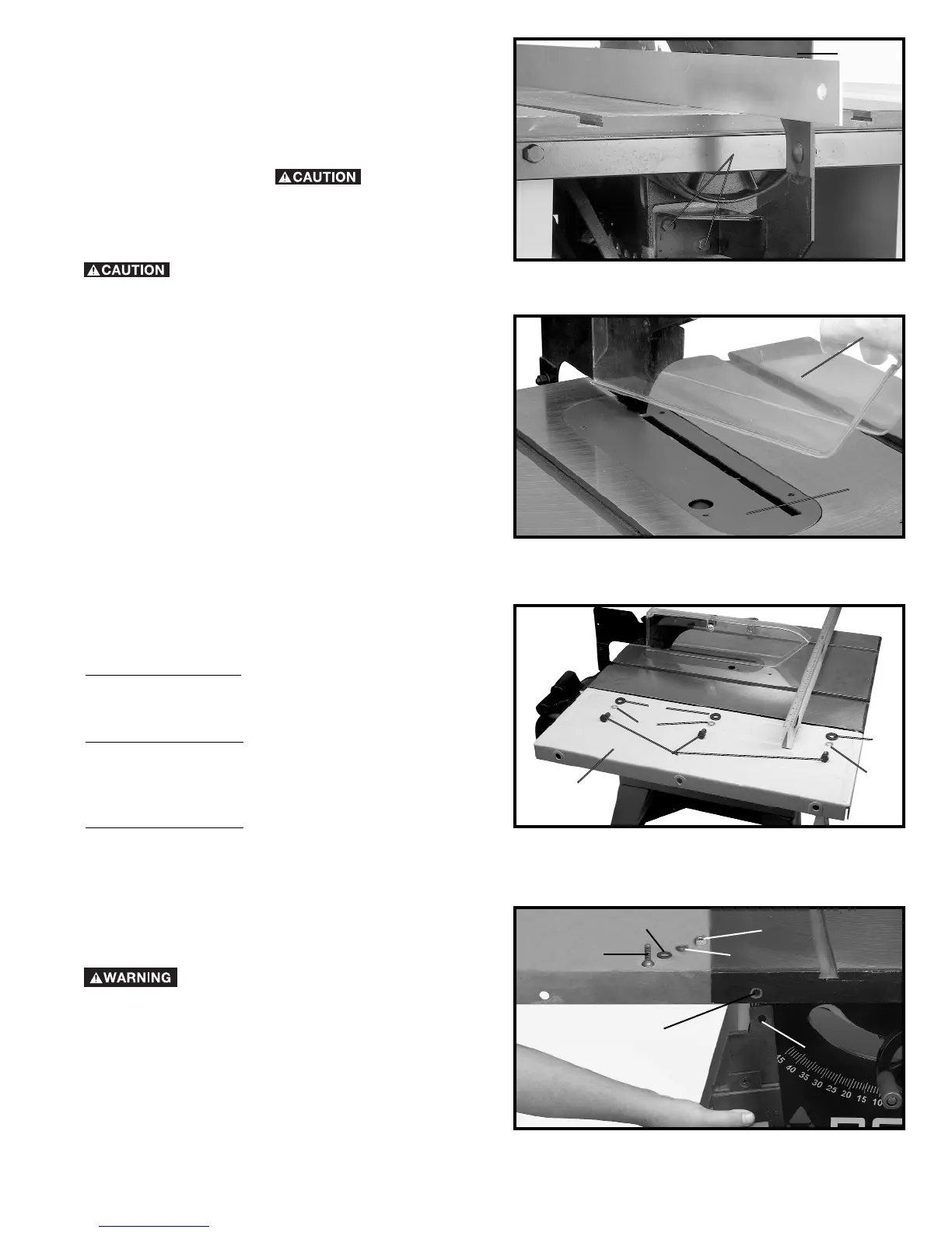 through hole (B) in the front the saw table. Place hole in