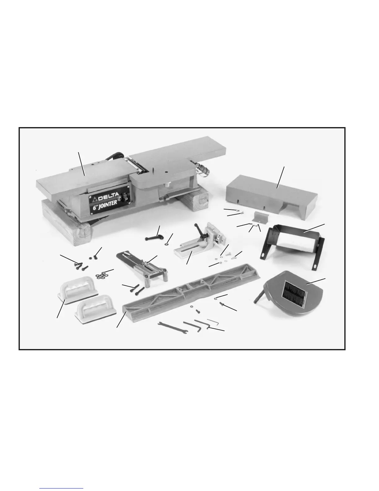 The 6 Motorized Jointer is shipped complete in one cont ainer . Carefully unp ack the jointer , st and, and all loose items