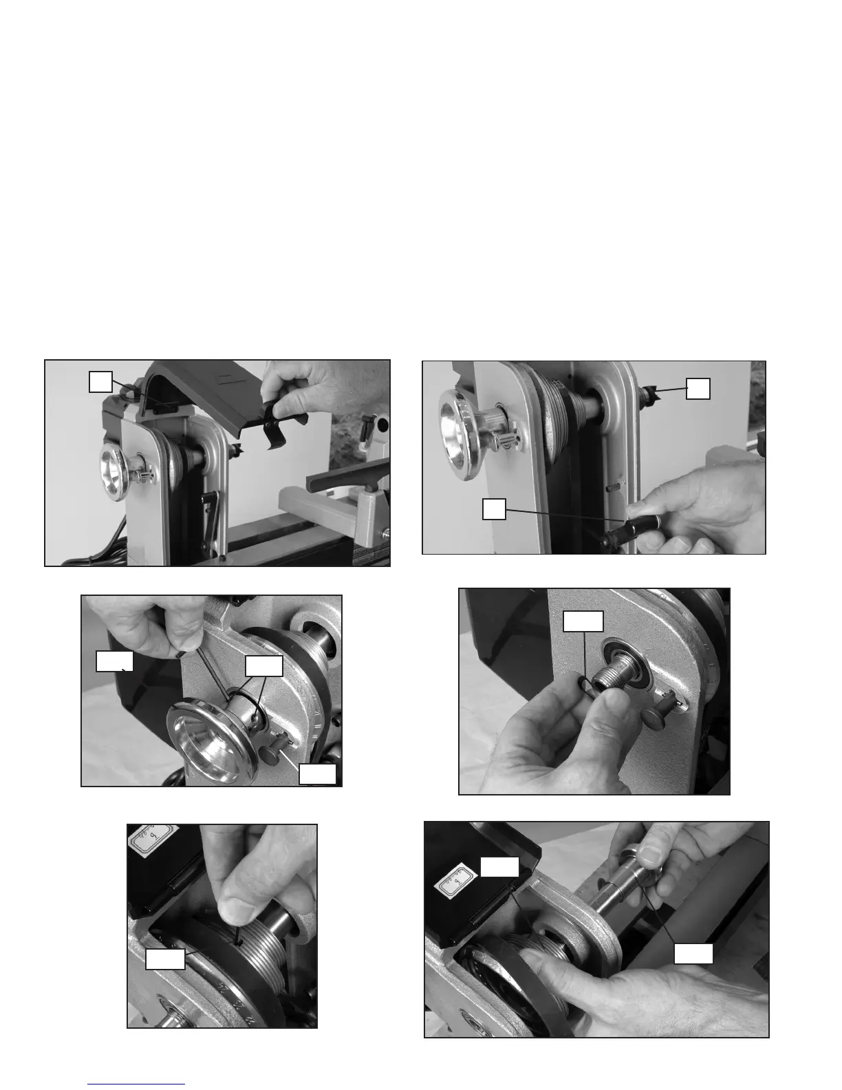 7. Loosen spindle pulley set screw (QQ) Fig. 33 with included hex wrench.