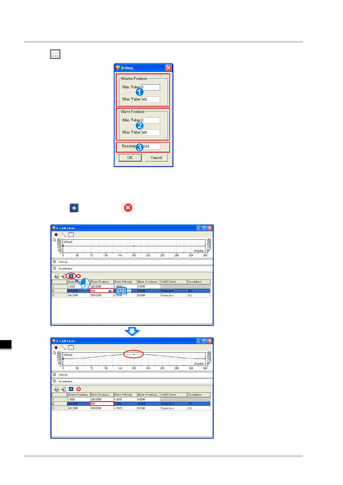Slave position: defines the display range of the slave axis in the E-CAM curve area.