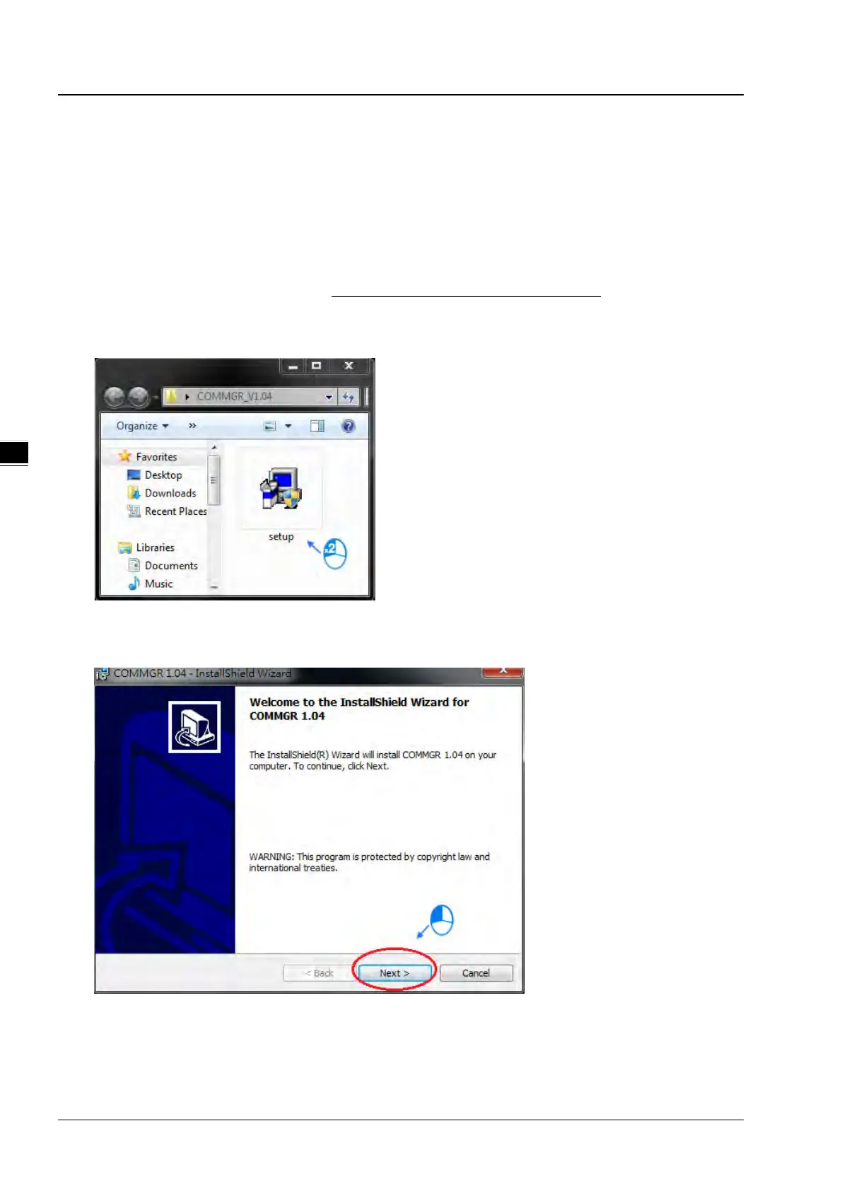 (4) After the COMMGR x.xx – InstallShield Wizard window appears, click Next.