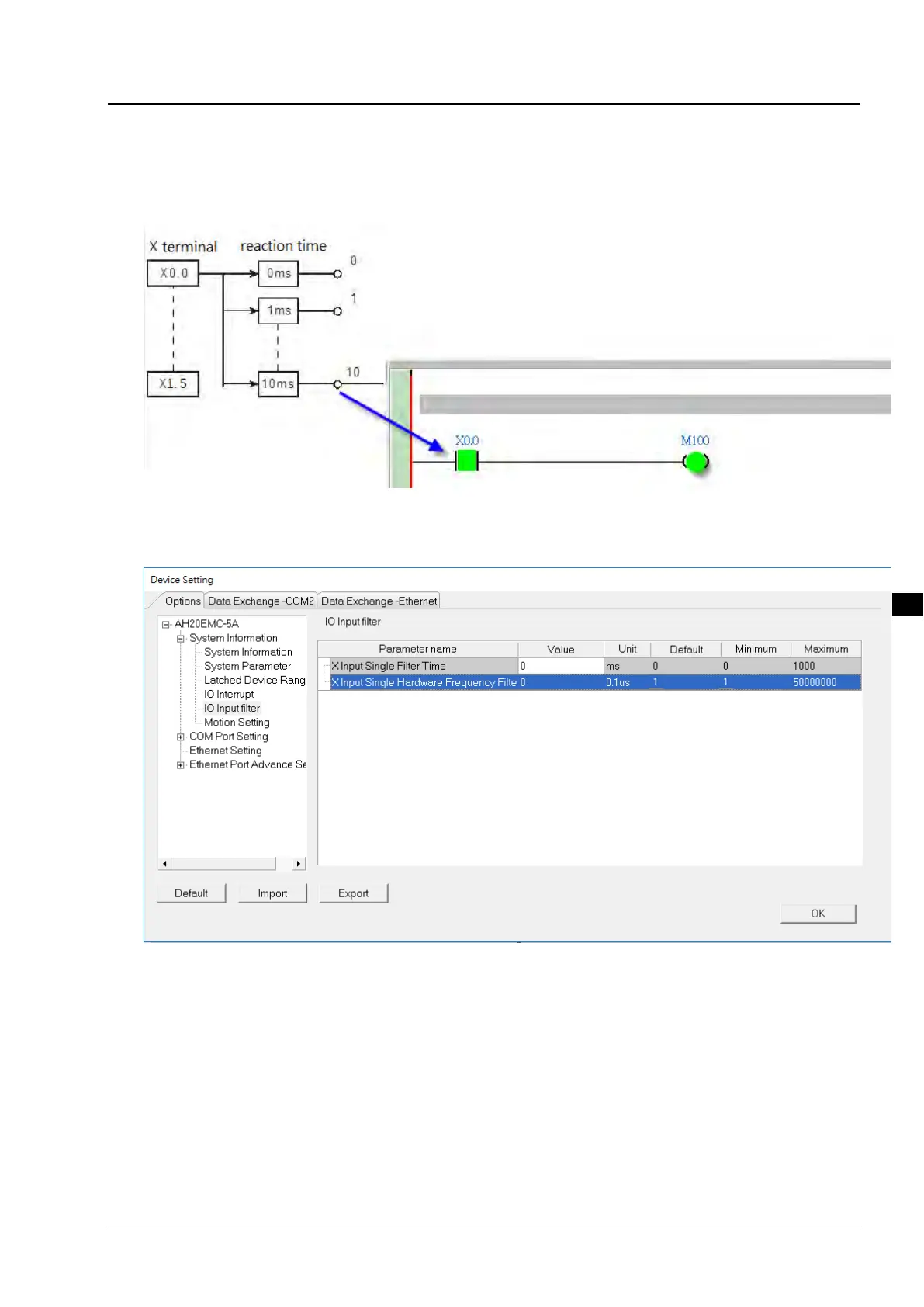 Example: the responding time for X input is set to 10 ms: M100 will stay ON, when the X0.0 signal lasts
