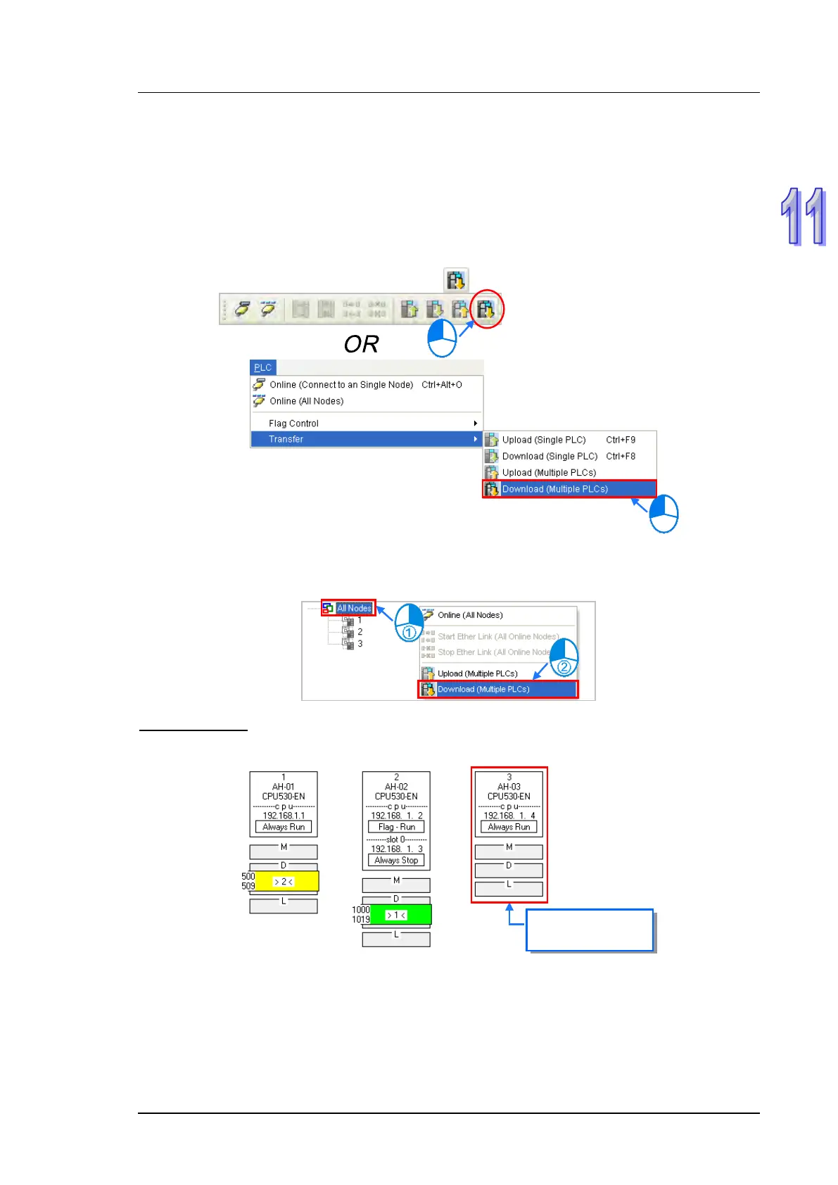 Click the PLC menu, point to Transfer, and click Download (Multiple PLCs). The users can also