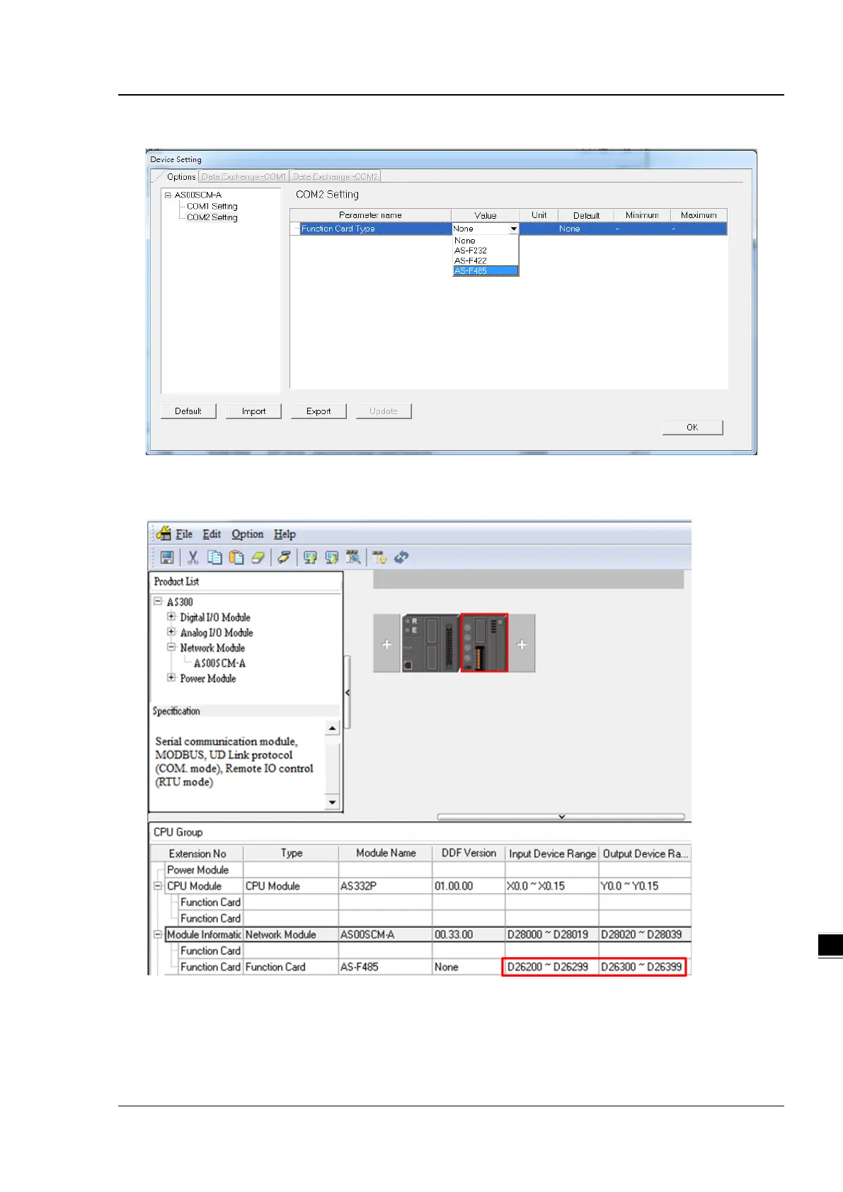 2) Double-click COM2 Setting and set the Function Card Type to AS-F485.