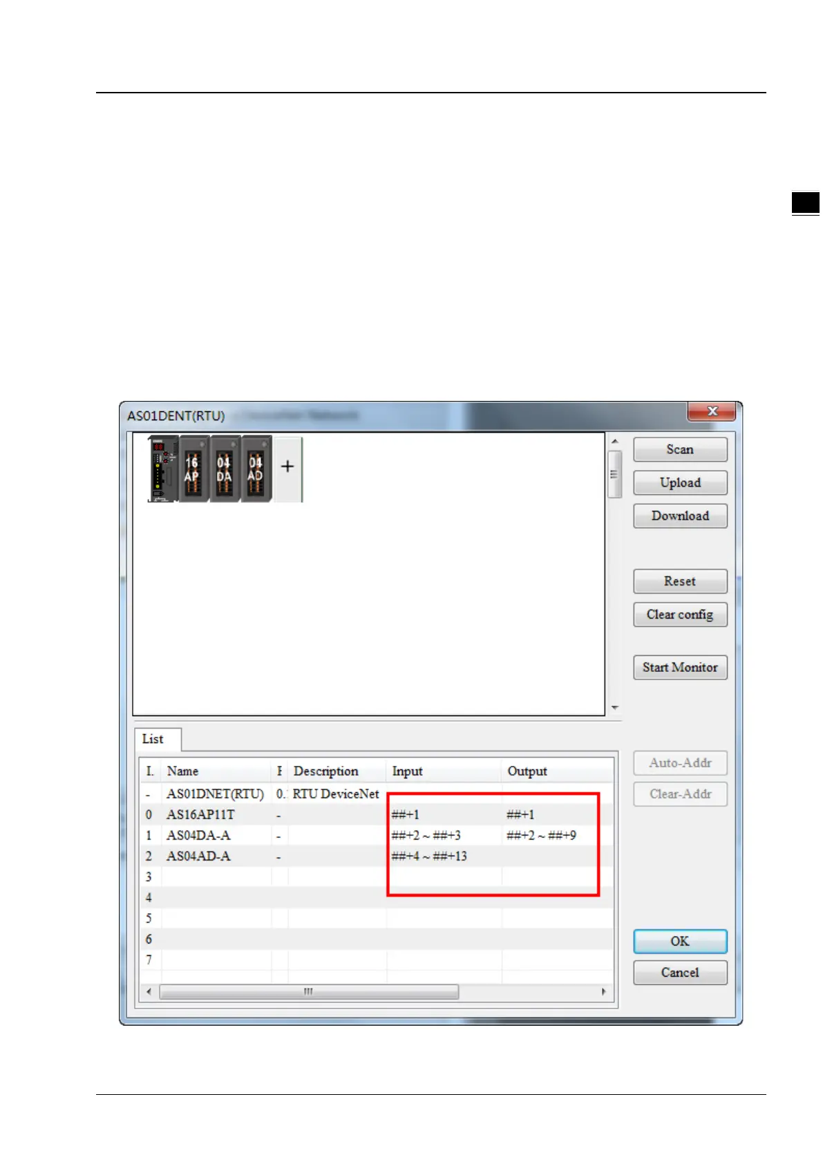 the start input mapping address and start output mapping address to AS01DNET (RTU), the contents in Input and Output