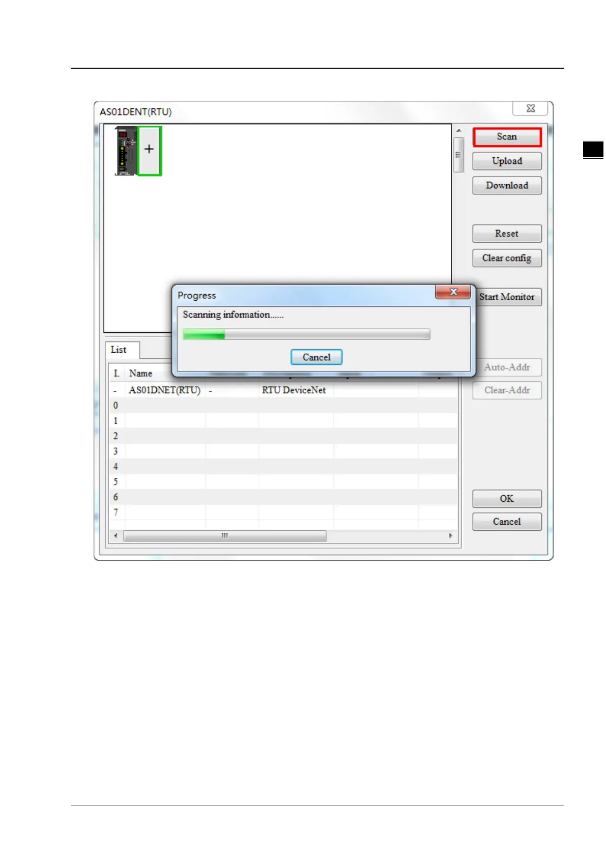 7. Click the Scan button to scan the I/O modules connected to the right side of AS01DNET (RTU).