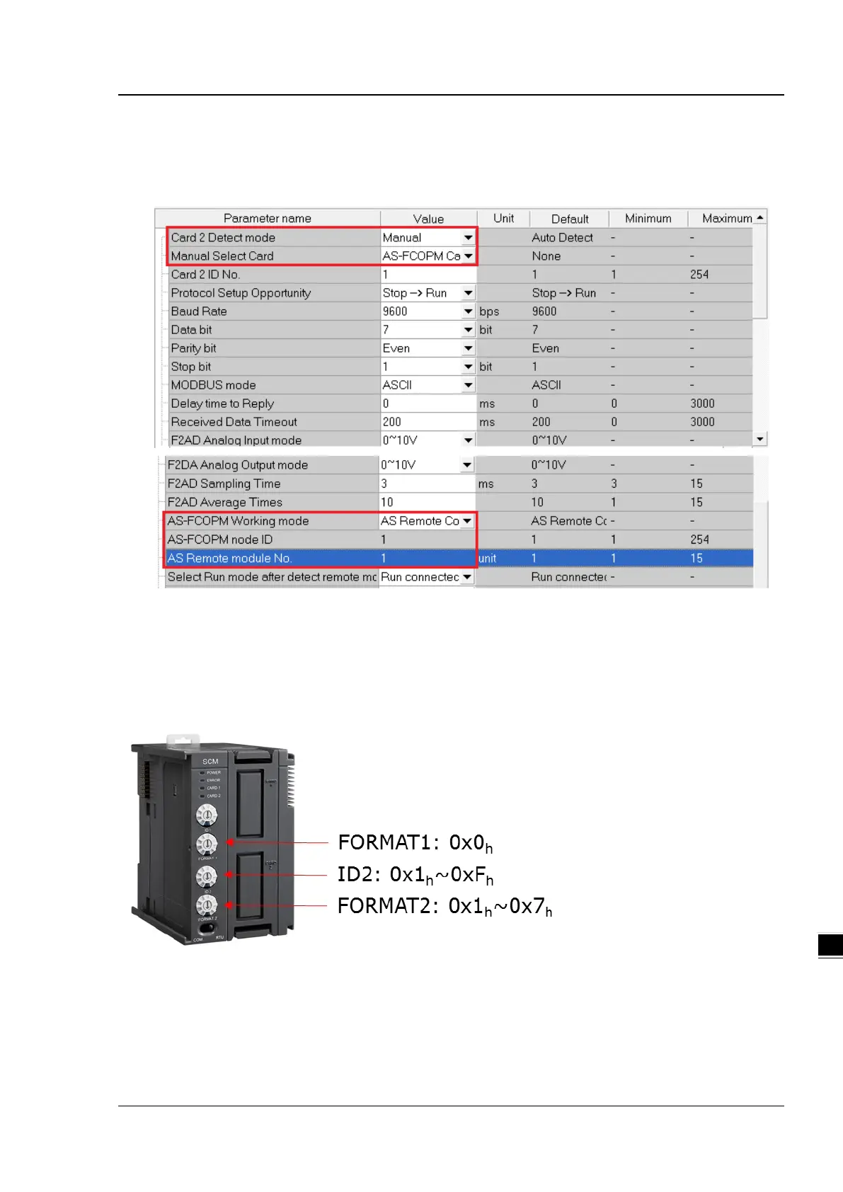 ISPSoft (HWCONFIG). Use the knob ID2 to set up Node ID and use the knob FORMAT2 to set up the baud rate.