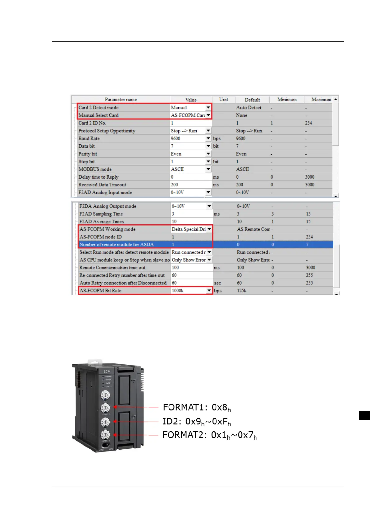 ISPSoft (HWCONFIG). Use the knob ID2 to set up Node ID and use the knob FORMAT2 to set up the baud