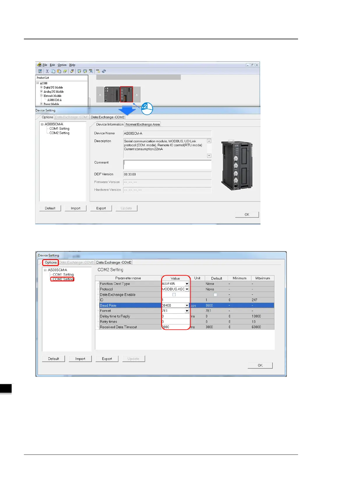 5) Set the communication protocol values for COM2:
