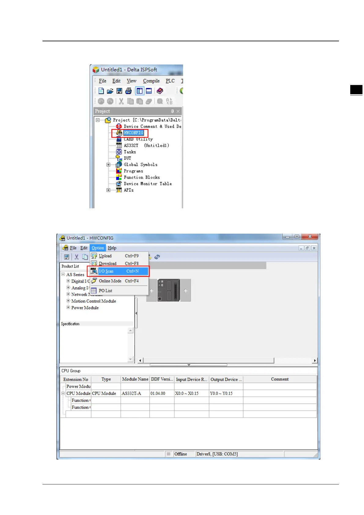 7. Select menu Option>> I/O Scan in the following window which pops up. Then the AS01DNET-5A icon will show