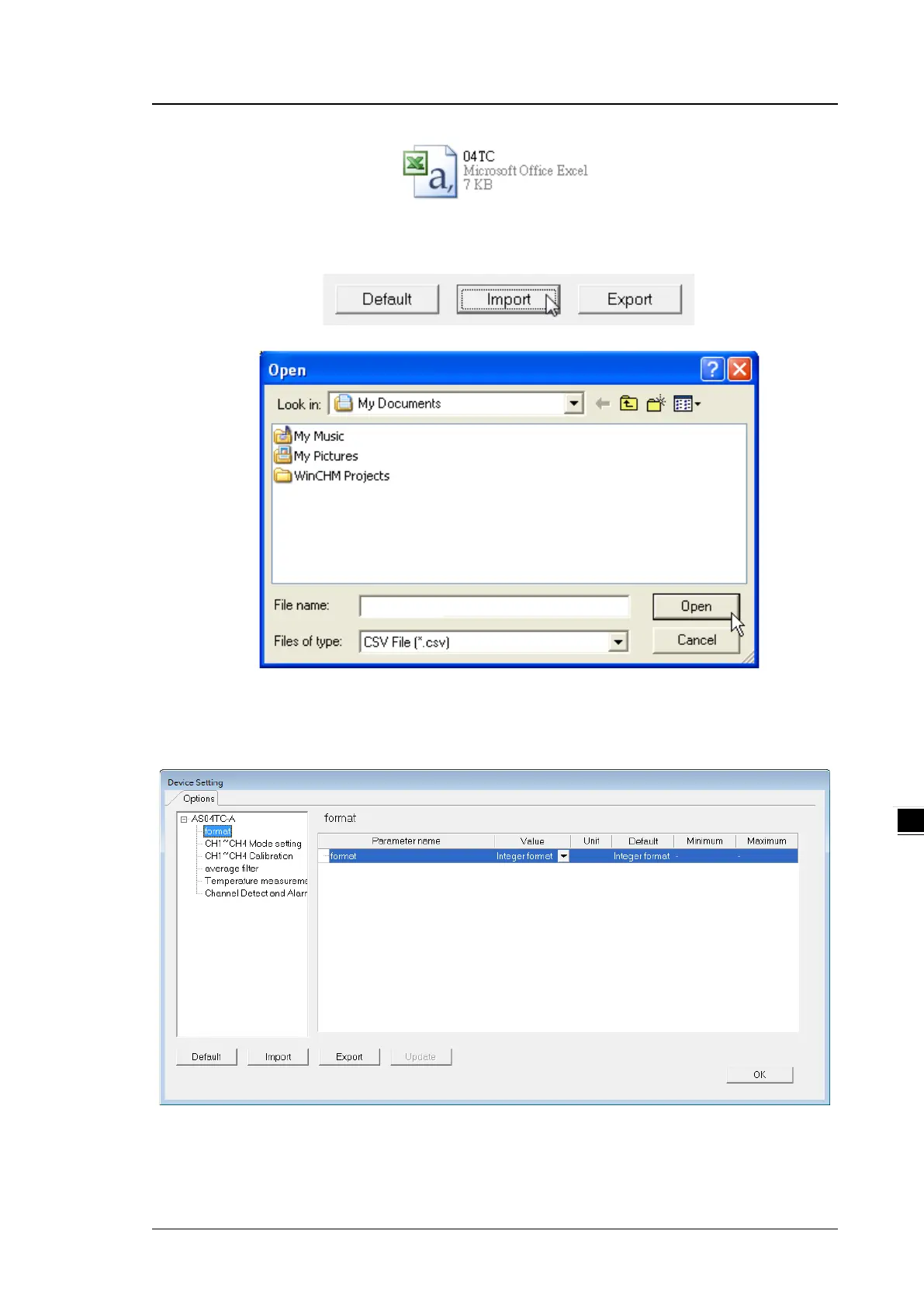 (2) Click Import in the Device Setting dialog box, and select a CSV file to import saved parameters.