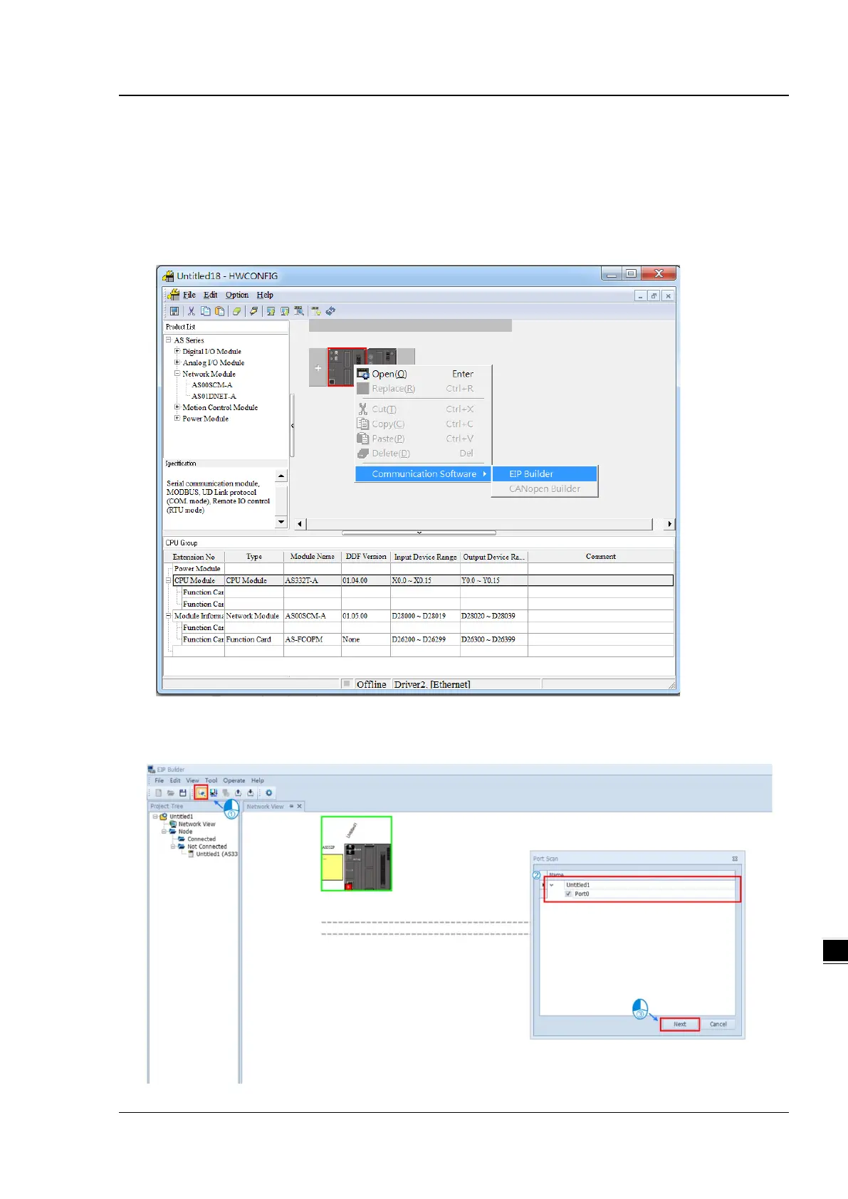 2. Scan the network to add AS-FEN02 (AS RTU) in EIP Builder. Drag the red block and drag it to the same network