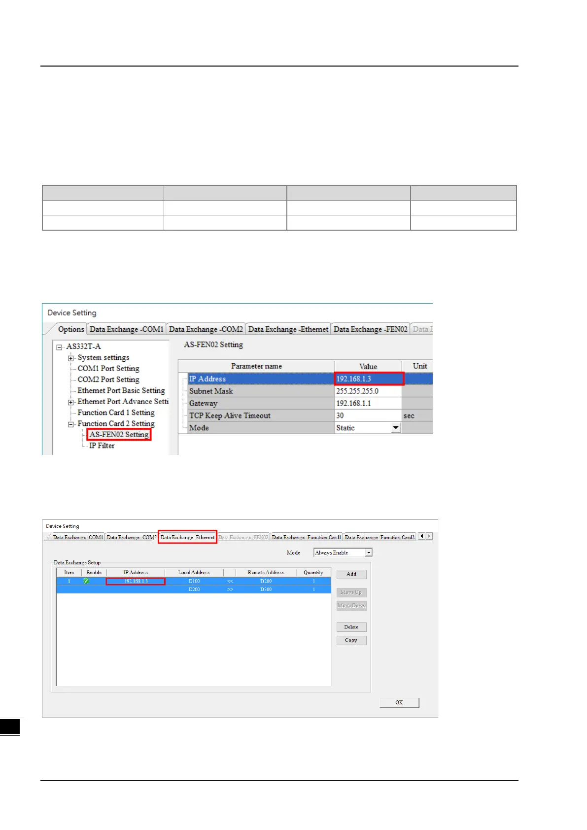 Double click AS Series PLC in HWCONFIG and the Device Setting window appears. Set up the IP Address of the A to