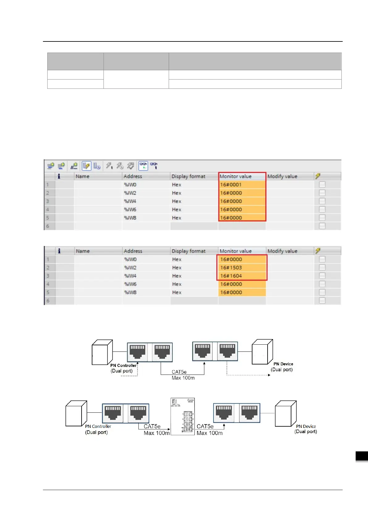 The unit for the address series is byte. The data size for each status register is one word; the indication is %IW0 (%IB0 &