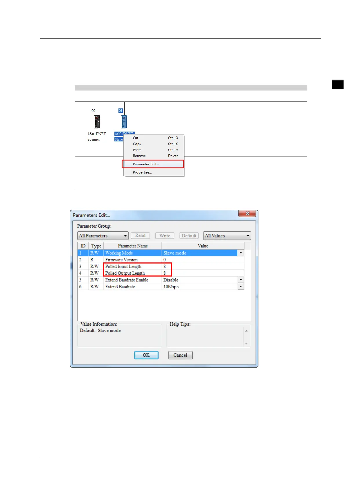 8. Right click the icon of AS01DNET Slave and click Parameter Editon the drop-down menu. The Parameters