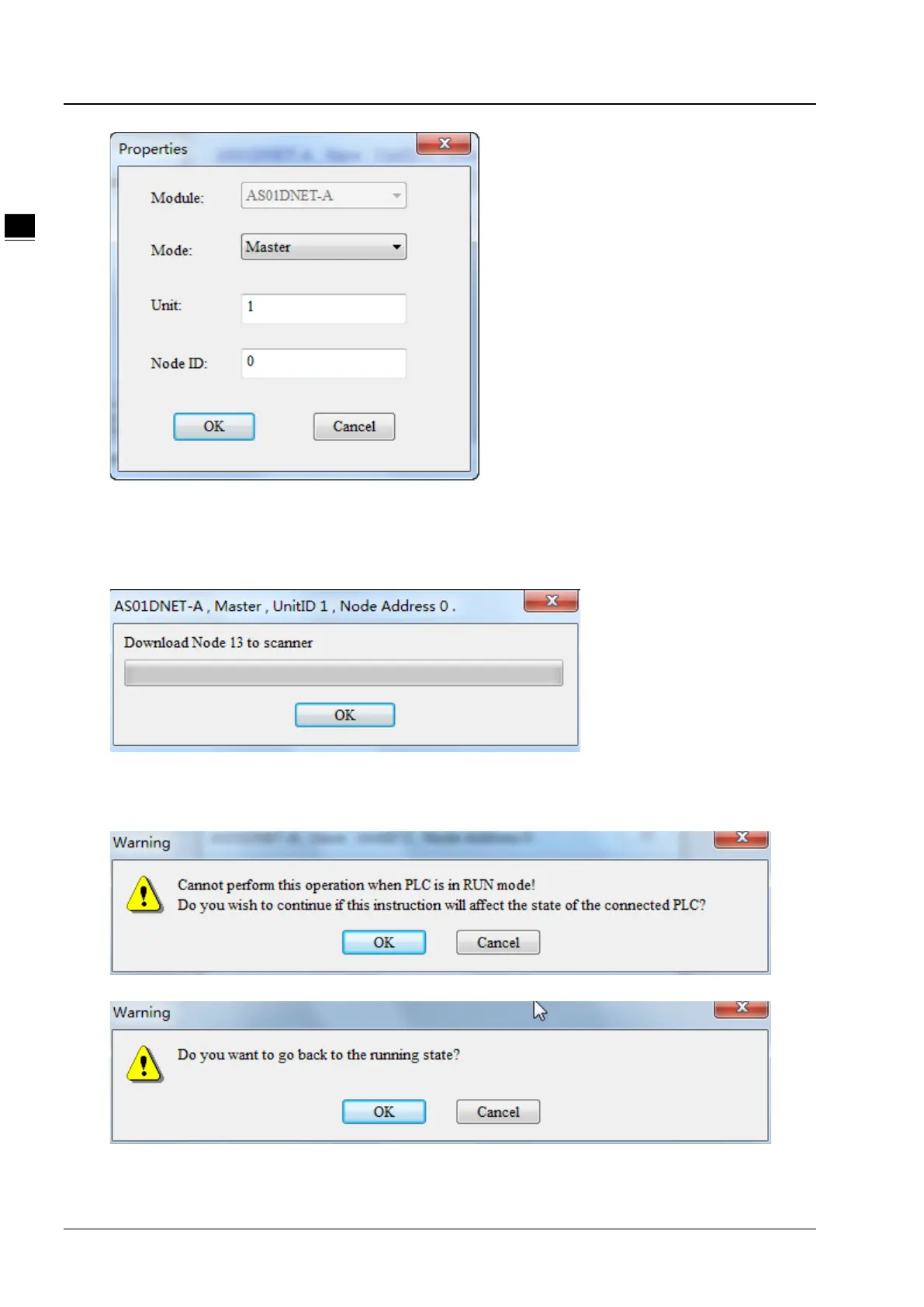 8. If the PLC is in RUN state, the Warning dialog boxes will pop out before and after the download. Users can click
