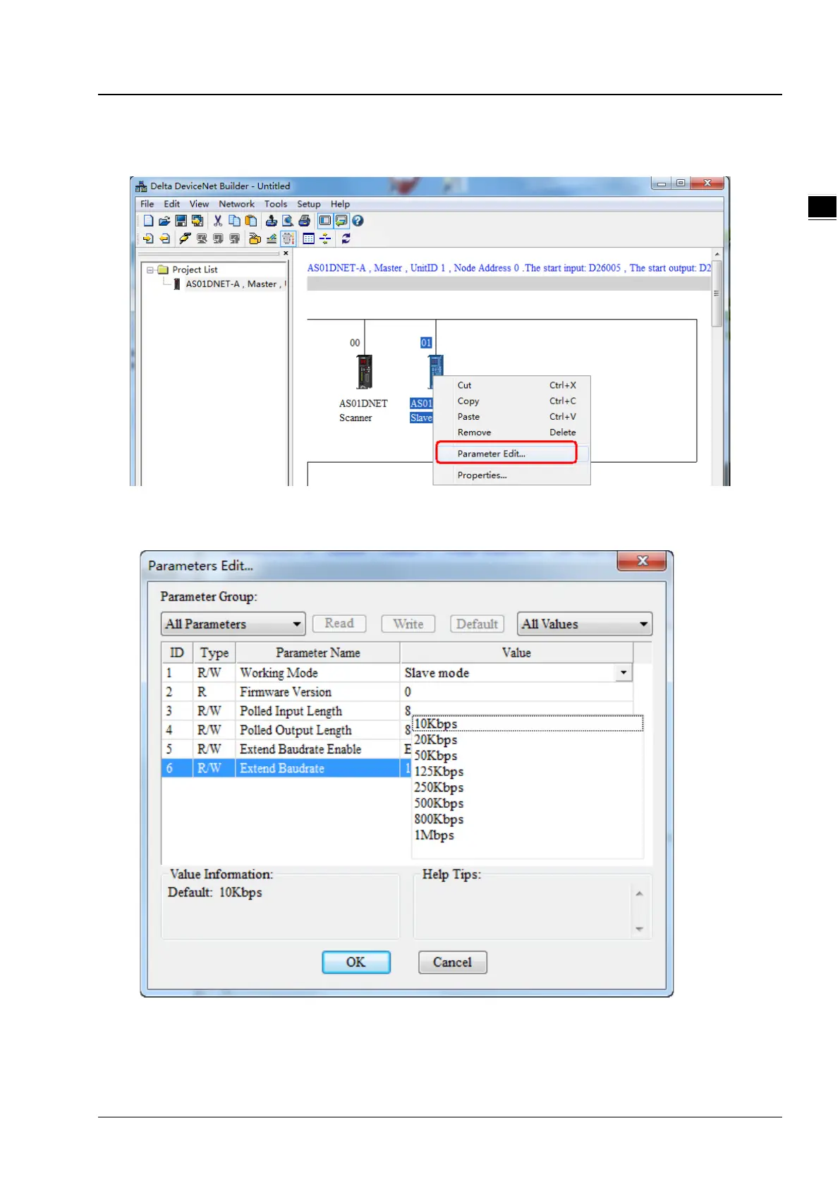 6. Right-click AS01DNET(Slave), select Parameter Edit on the drop-down menu to enter the Parameter Edit