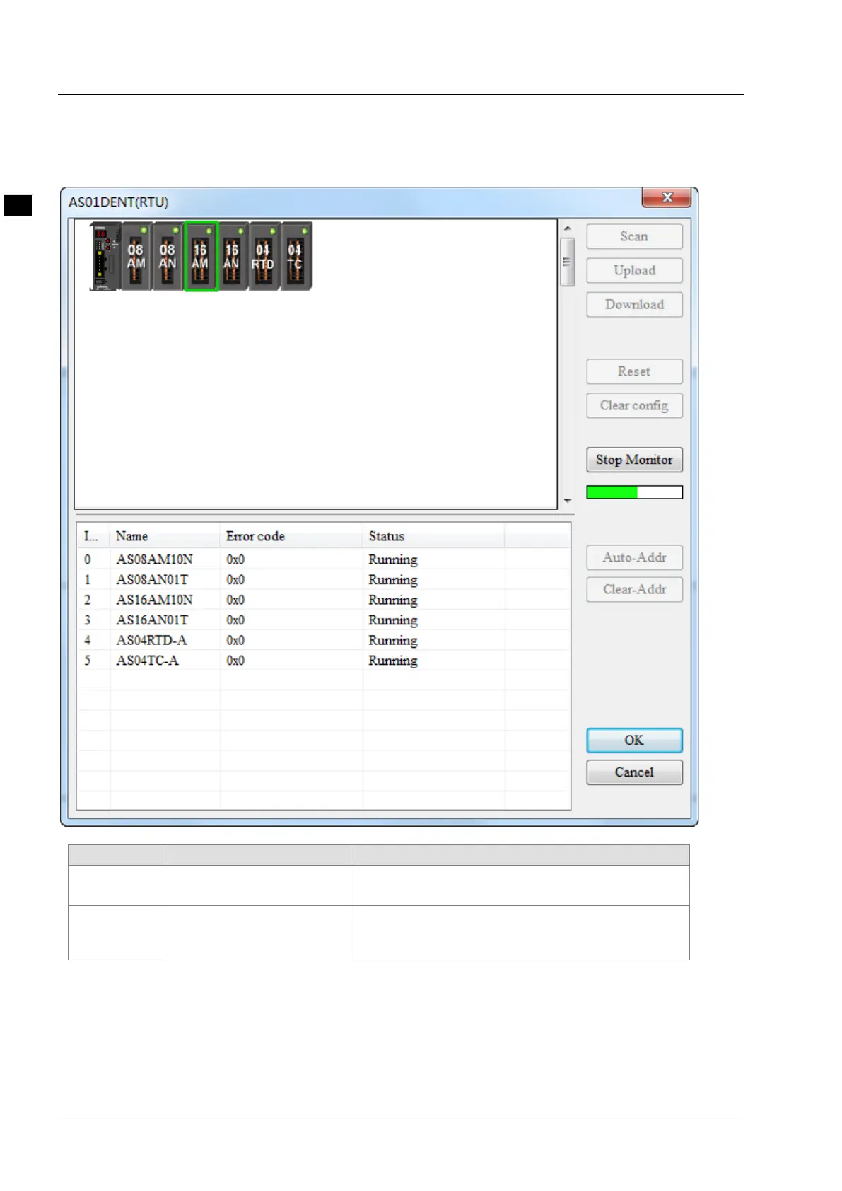 Click the Start Monitor button on the AS01DNET (RTU) interface. The Error code column will show relevant contents as