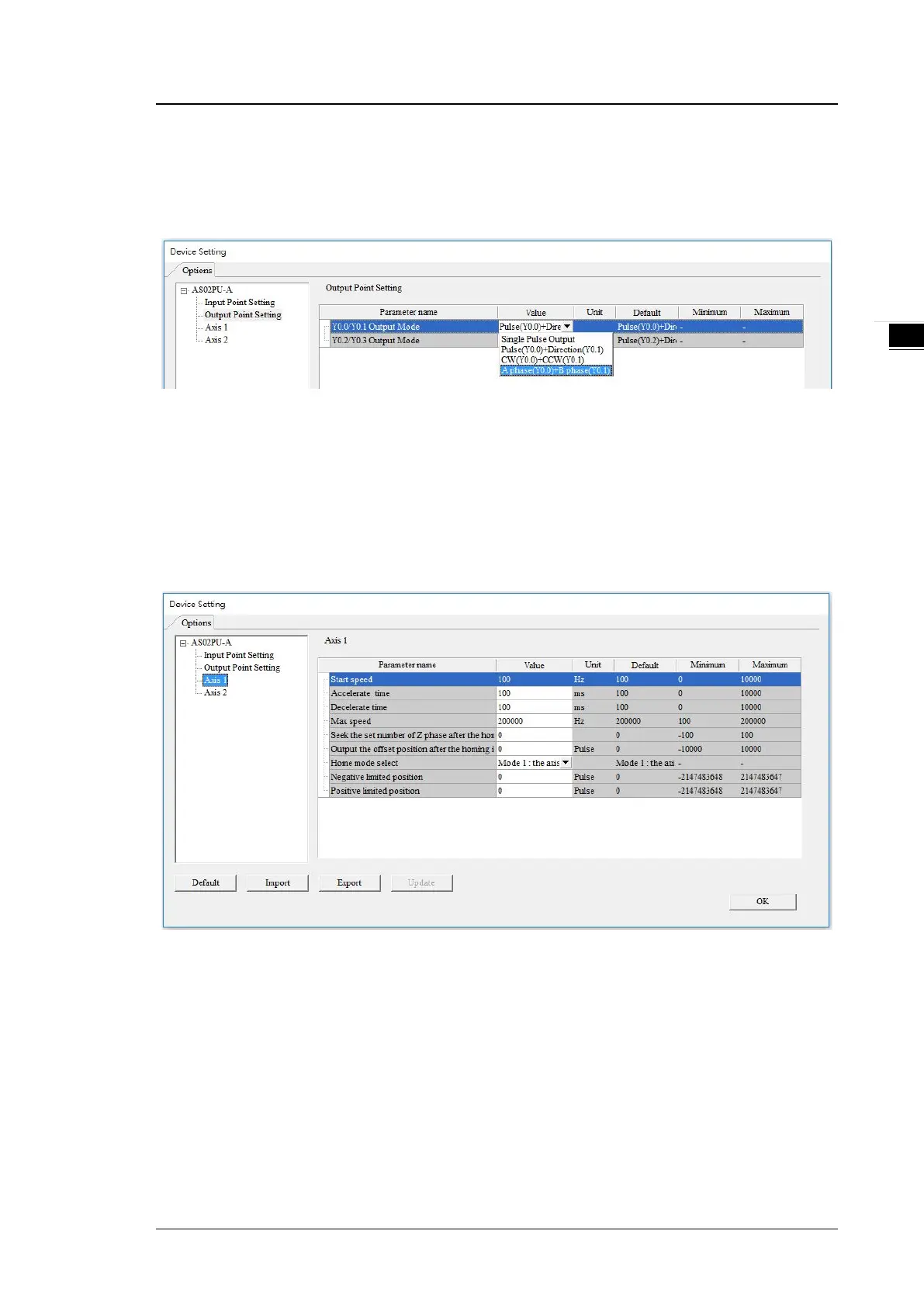 You can set values in the output points (single pulse output, pulse + direction, CW+CCW, A phase + B