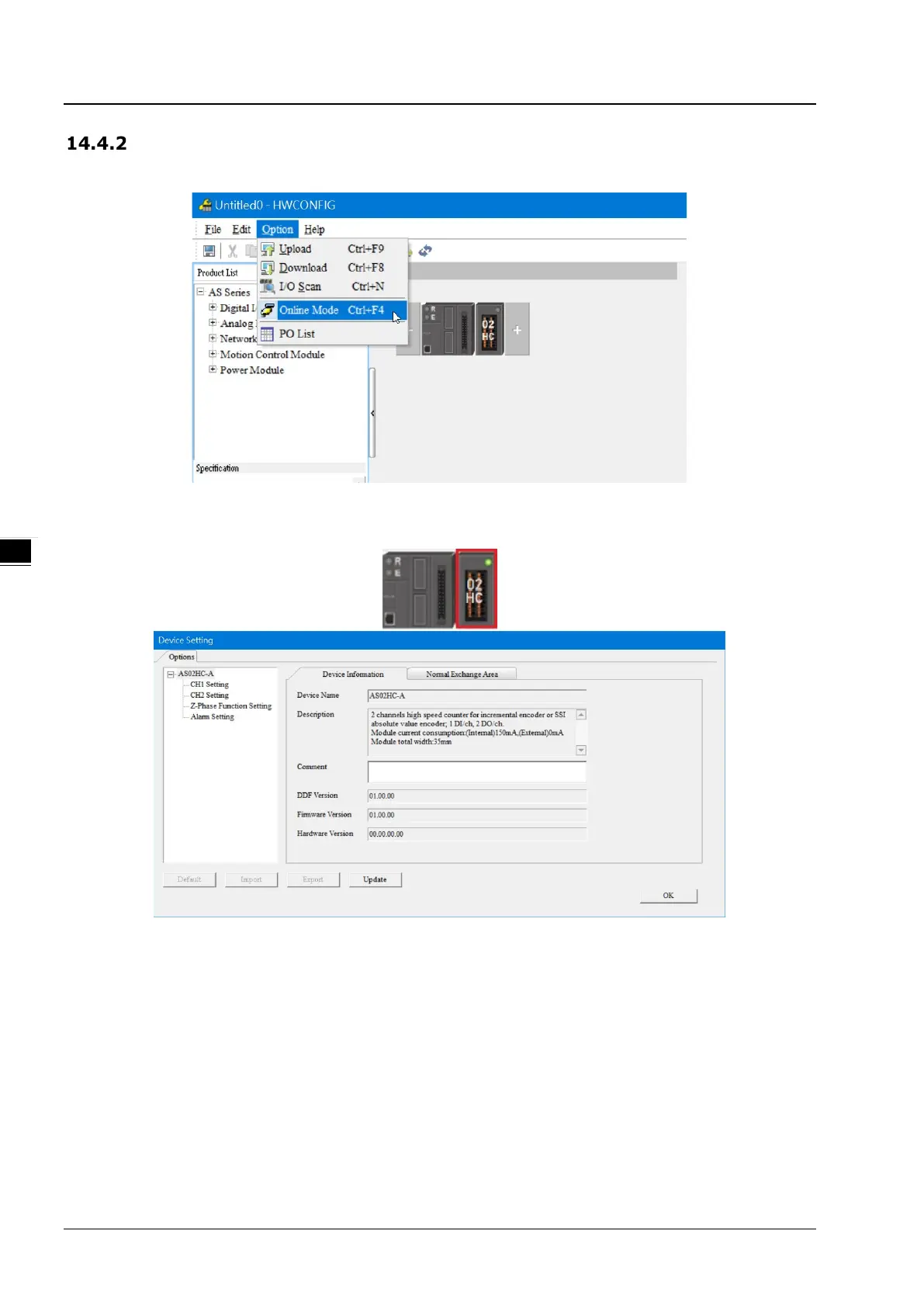 2. Double-click AS02HC module to check the firmware version and hardware version.