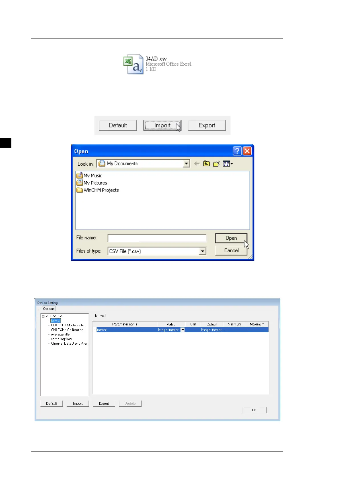 (2) Click Import in the Device Settings dialog box and select a CSV file to import saved parameters.