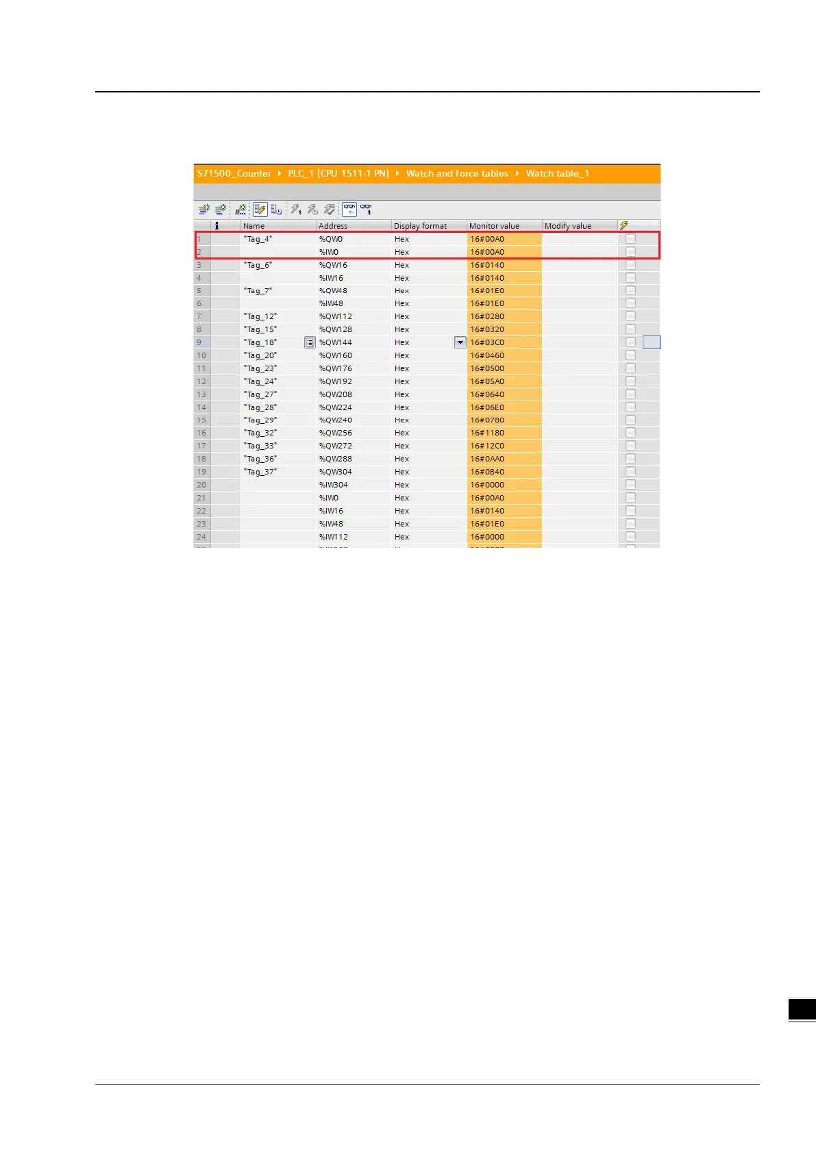 Check if the monitor values of registers QW0 and IW0 in the Watch Table are the same to determine the data exchange