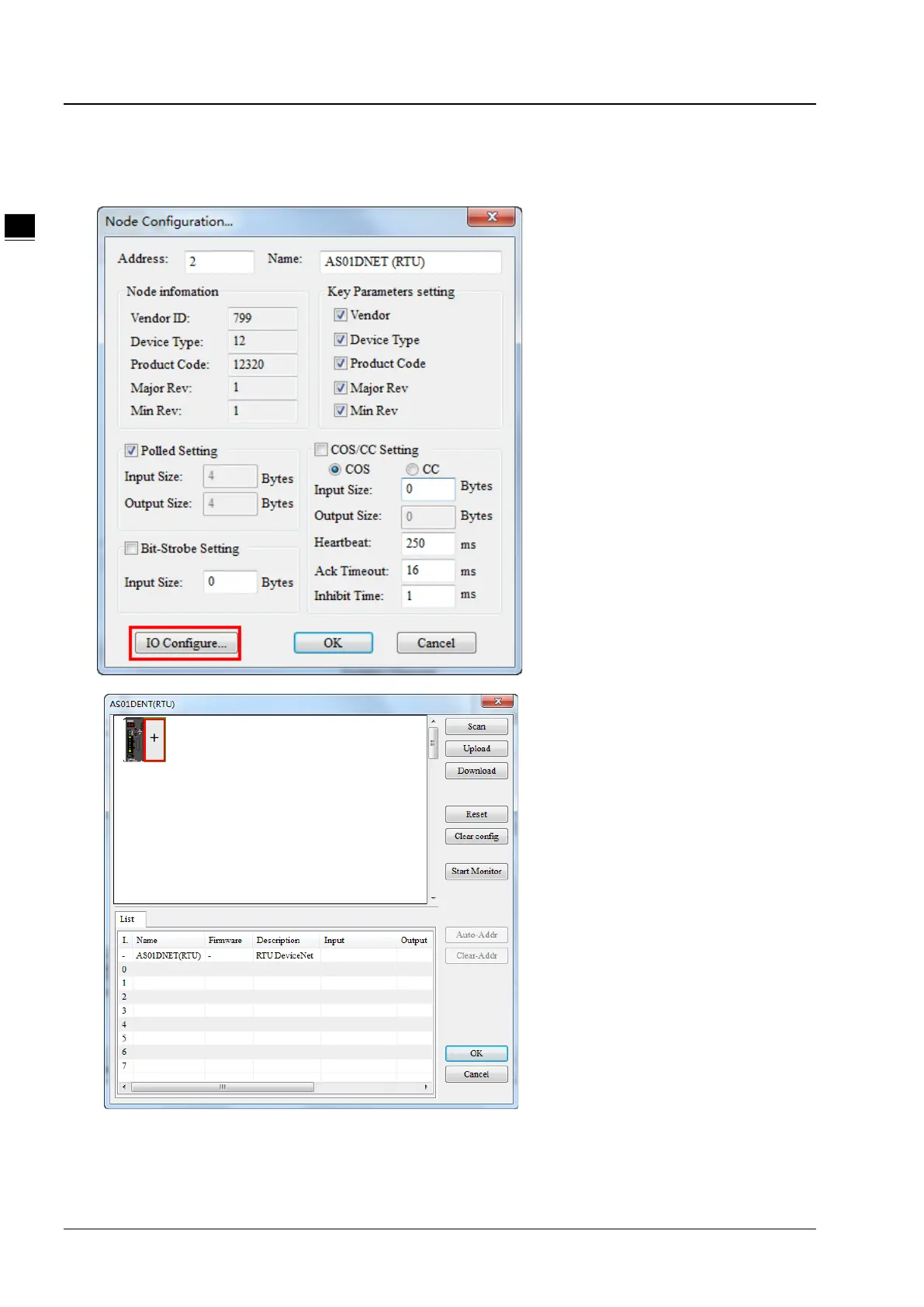6. Double click AS01DNET (RTU). Then the Node Configuration dialog box appears. Click the IO Configure
