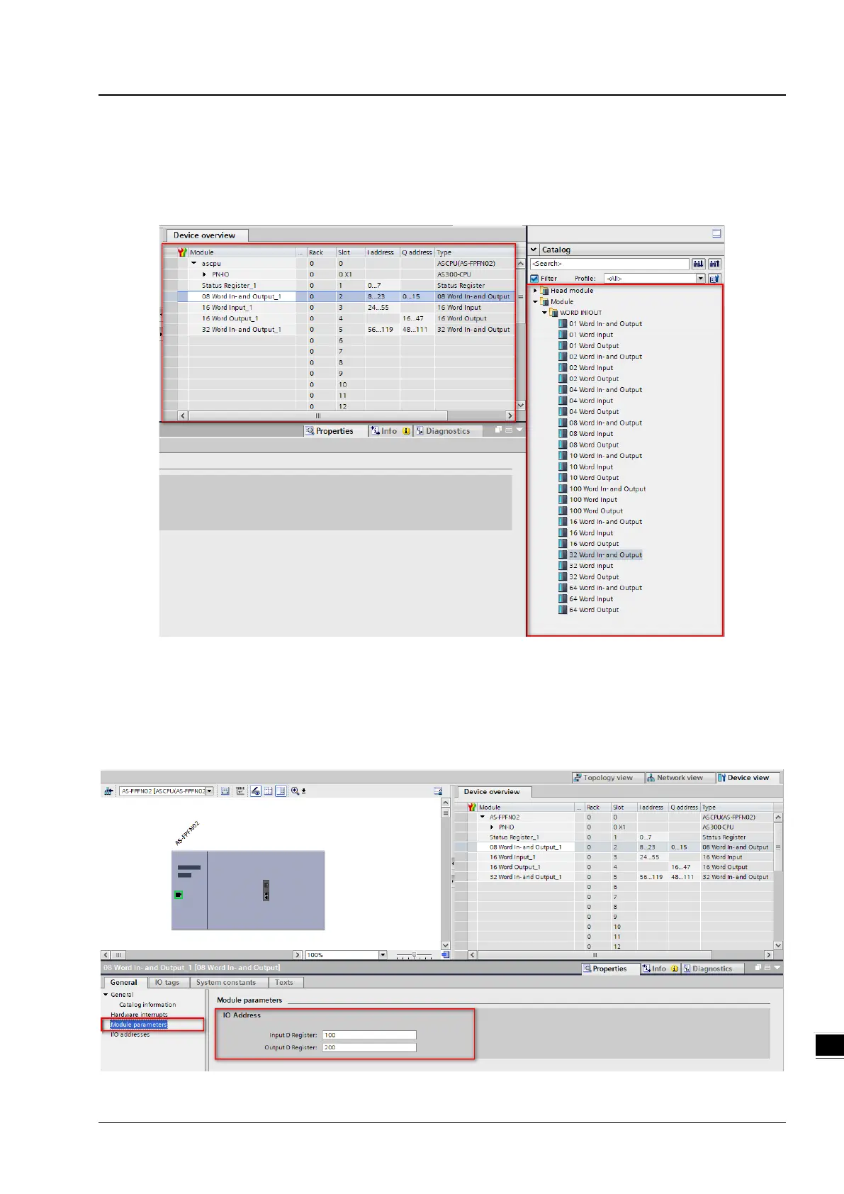 Enter the starting address in Module Parameters for data exchange. When entering 100 in Input D Register and 200 in