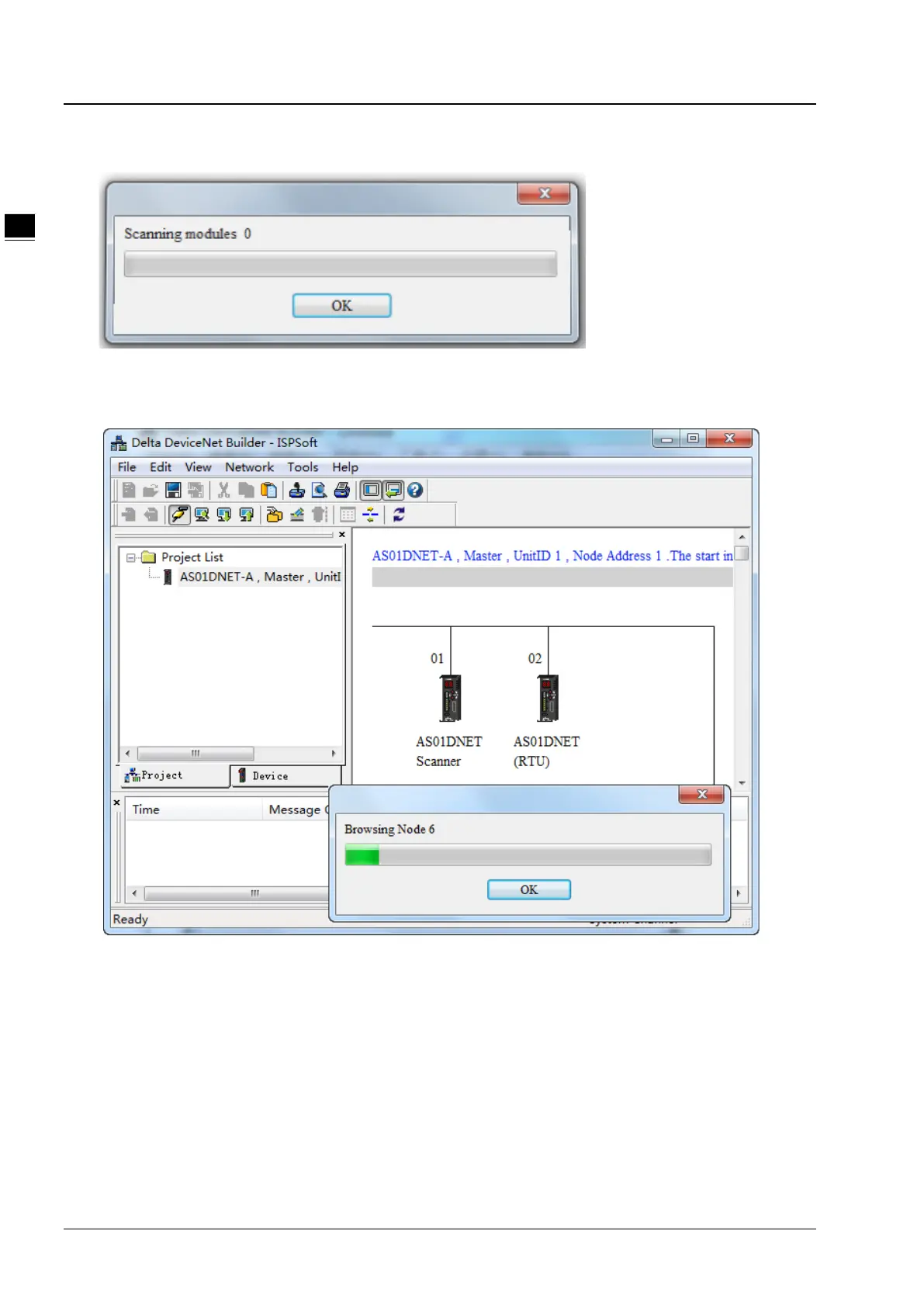 7. After online is implemented, click the Scan DeviceNet Network button to start scanning the nodes in the network.